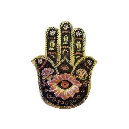 Beautifully tooled resin with a black base color predominantly highlighted with gold designing. This Flat Hamsa Hand has an incense burner hole on it's palm in the center of "the eye". Measures 5' long x 3 1/2 from tip to tip width.
