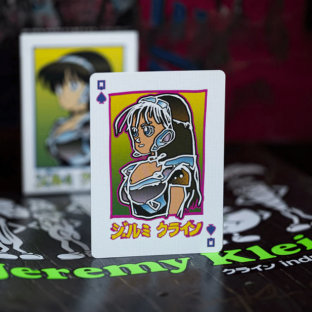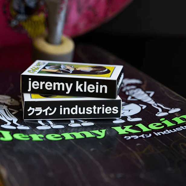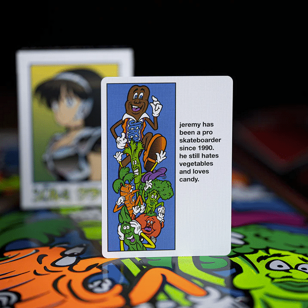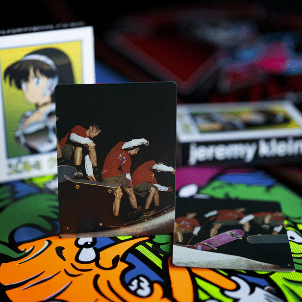 Every card is custom. The court cards were illustrated by legends Mark Gonzales and Lance Mountain. Featuring ad card photography by Spike Jonze. These cards are the first of their kind and celebrate the lengthy career of my favorite skateboarder and close friend, Jeremy Klein.