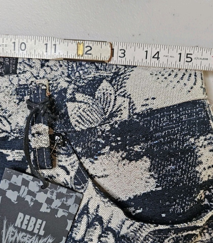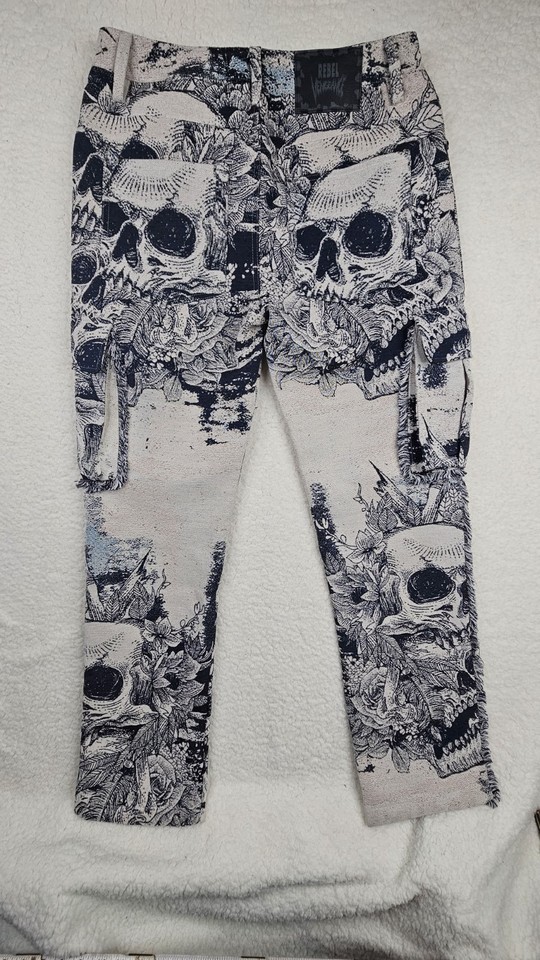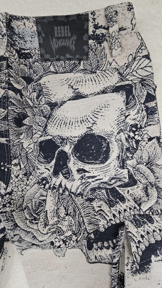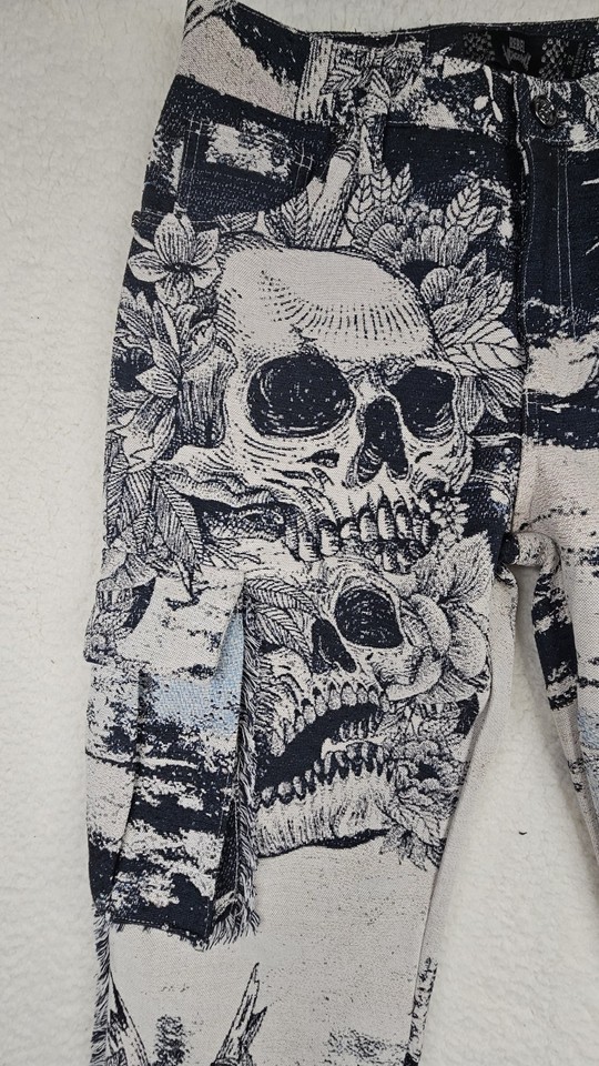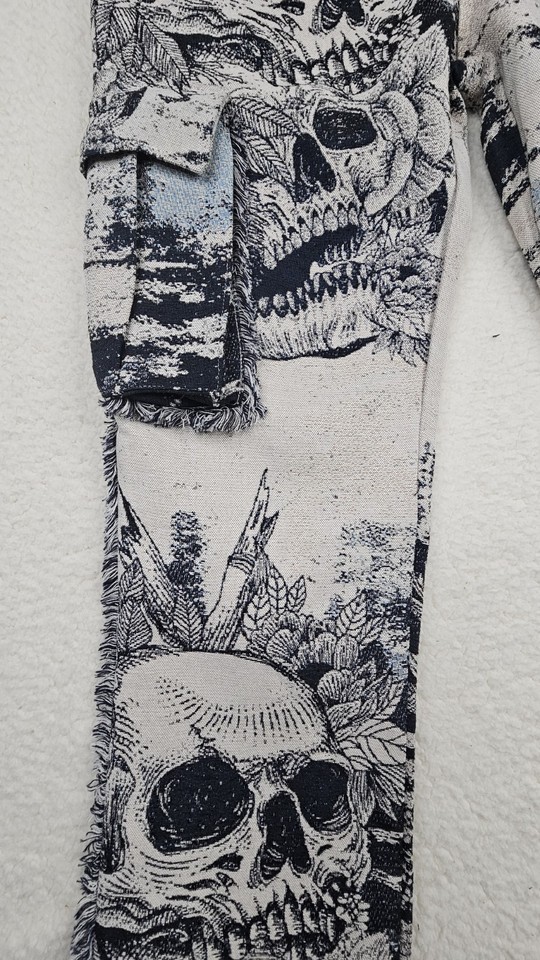 Rebel Vengeance Skull Print Tapestry Goth Cargo Pants Mens 30 Fringe On Sides