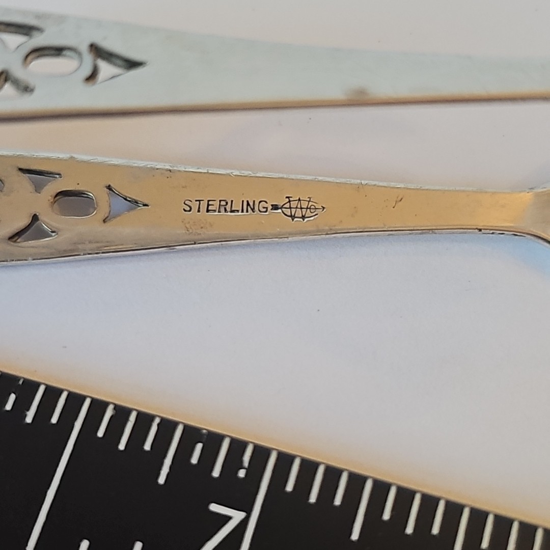 This product is a vintage set of sterling silver sugar cube ice claw tongs with a monogram brand. The tongs feature a unique design for gripping ice cubes or sugar cubes, making them a functional and decorative addition to any kitchen or dining room. Crafted with high-quality sterling silver, these tongs are durable and timeless, perfect for adding a touch of elegance to your table setting.