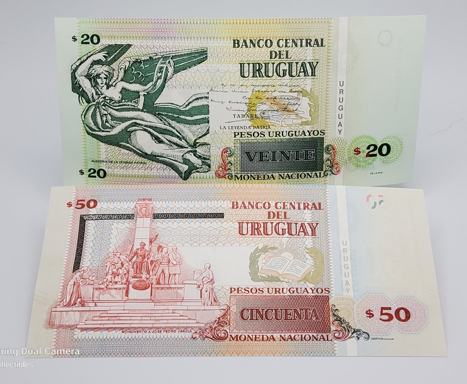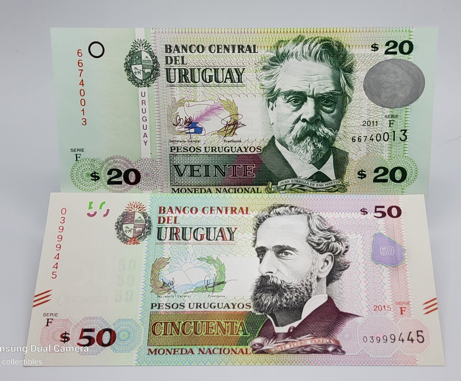 URUGUAY Banknotes 20 Pesos 2011 P-86b 50 Pesos 2015 P-94 ~ Uncirculated