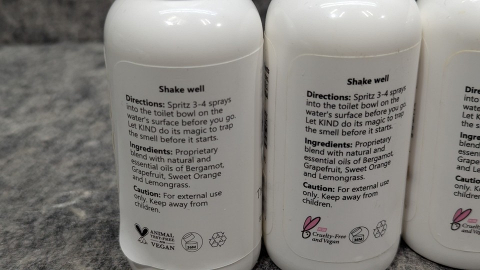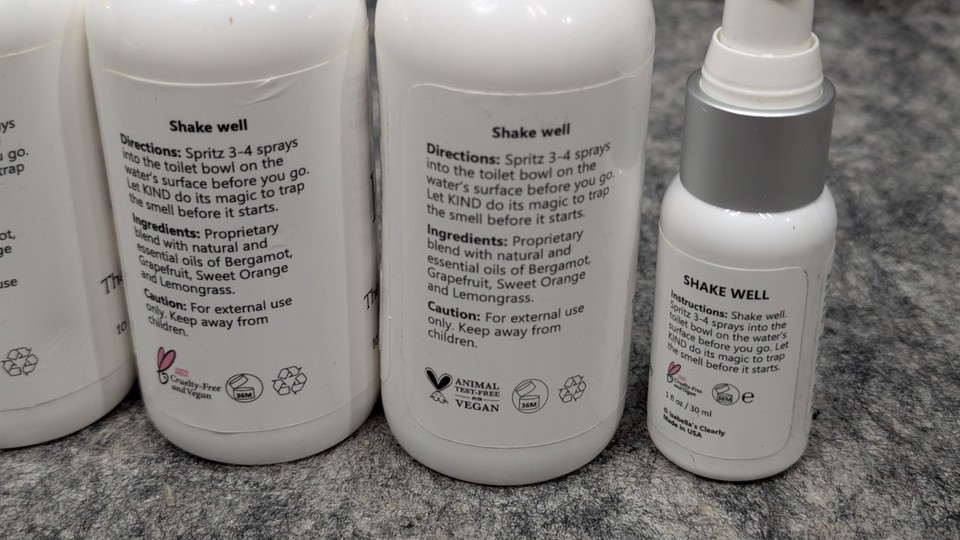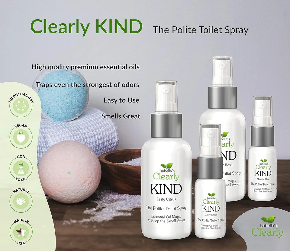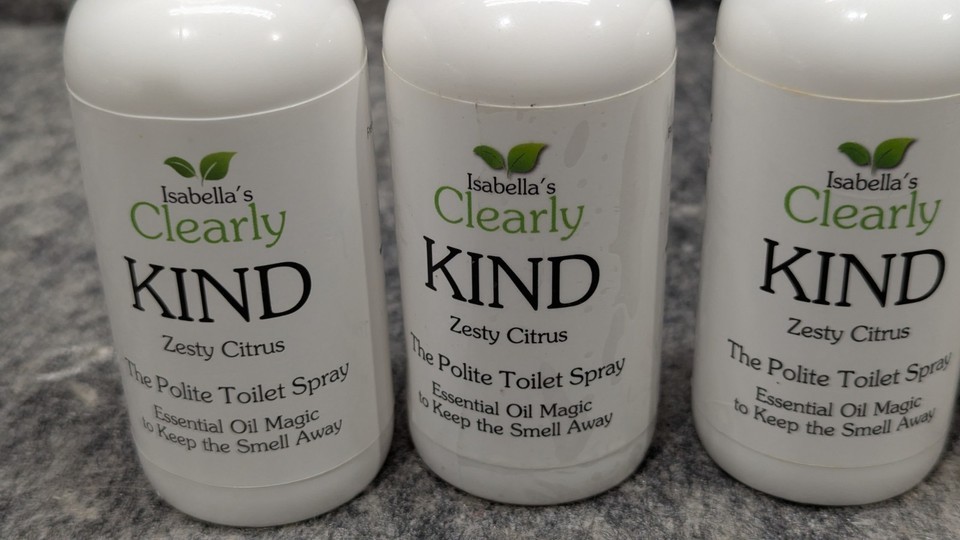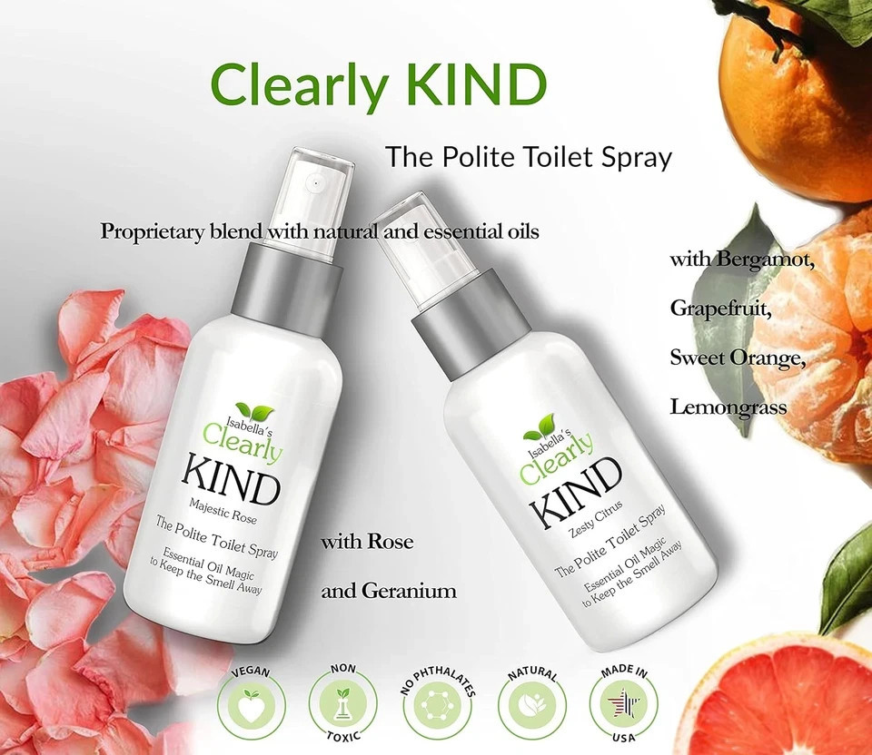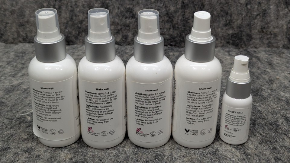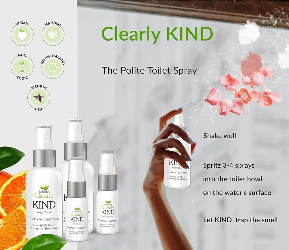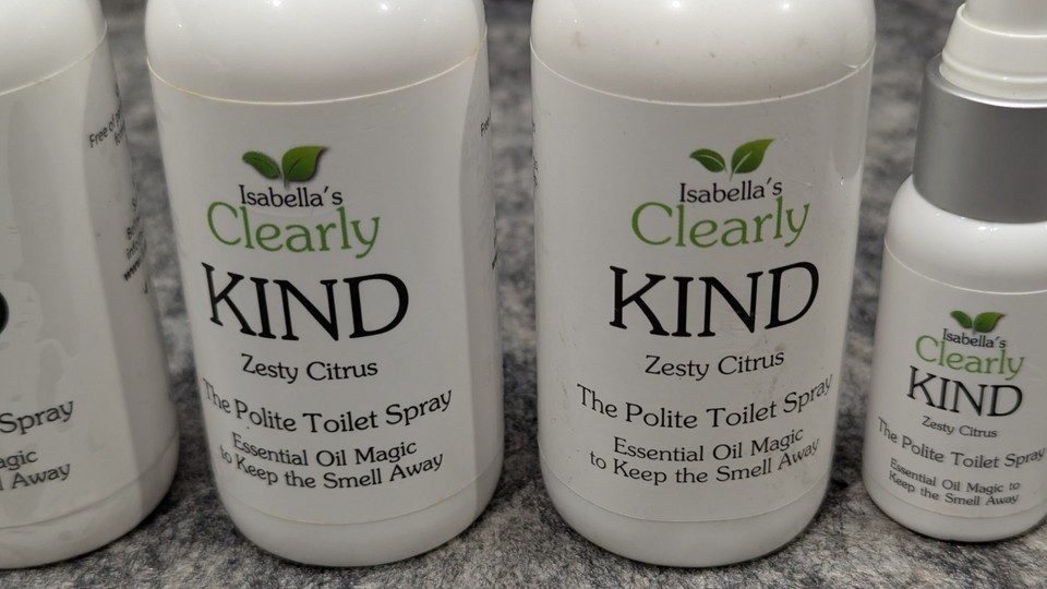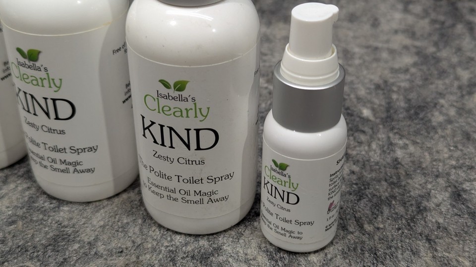 Brand new and Sealed 4 Pack Clearly KIND, The Polite Odor Eliminator "Before you Poop" Toilet Spray | Pre Poo Essential Oil Magic Keeps the Smell Away | 100% Natural Bathroom Spray, 4 x 4 Oz 2 x 1 Oz (Zesty Citrus). See pictures for full descriptions. Sold as pictured.