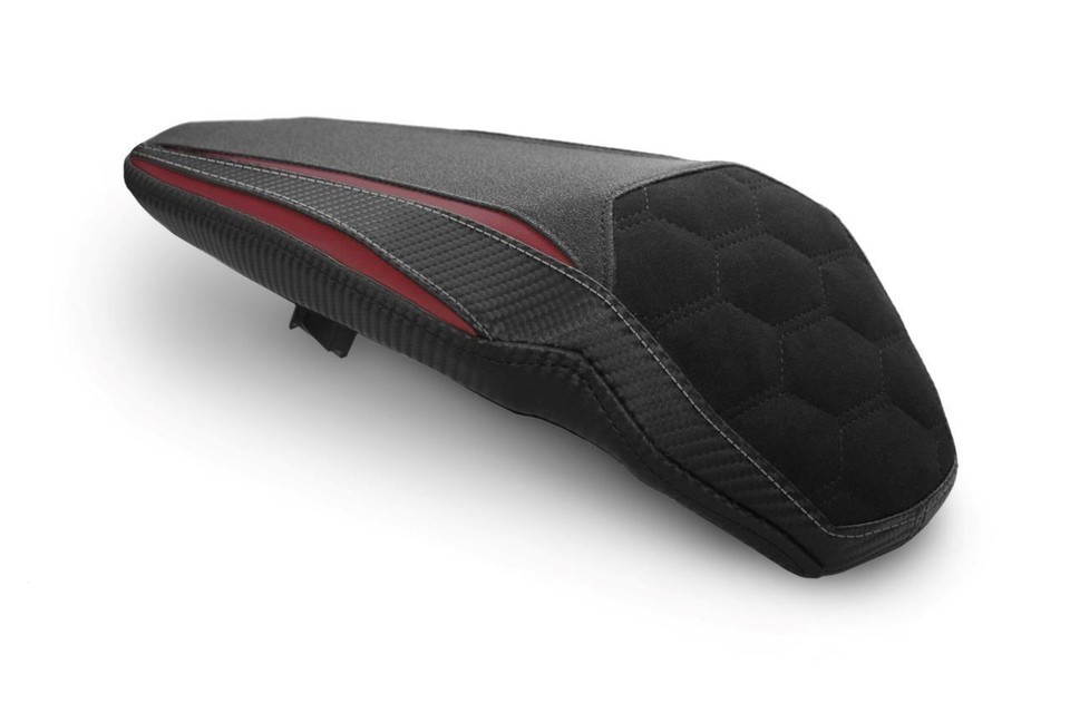 Introducing the Hypersport seat cover for your Kawasaki ZH2! Featuring supreme quality and craftsmanship with style ready to take on any streetfight. The luxurious synthetic suede riding surface features technical hexagon stitching. Tec-grip front and rear pads promote rider stability while accelerating and braking. Quad stripes and angular panels in carbon fiber look marine-grade vinyl match the aggressive lines of your motorcycle. Stand out with the finishing touch of Luimoto!