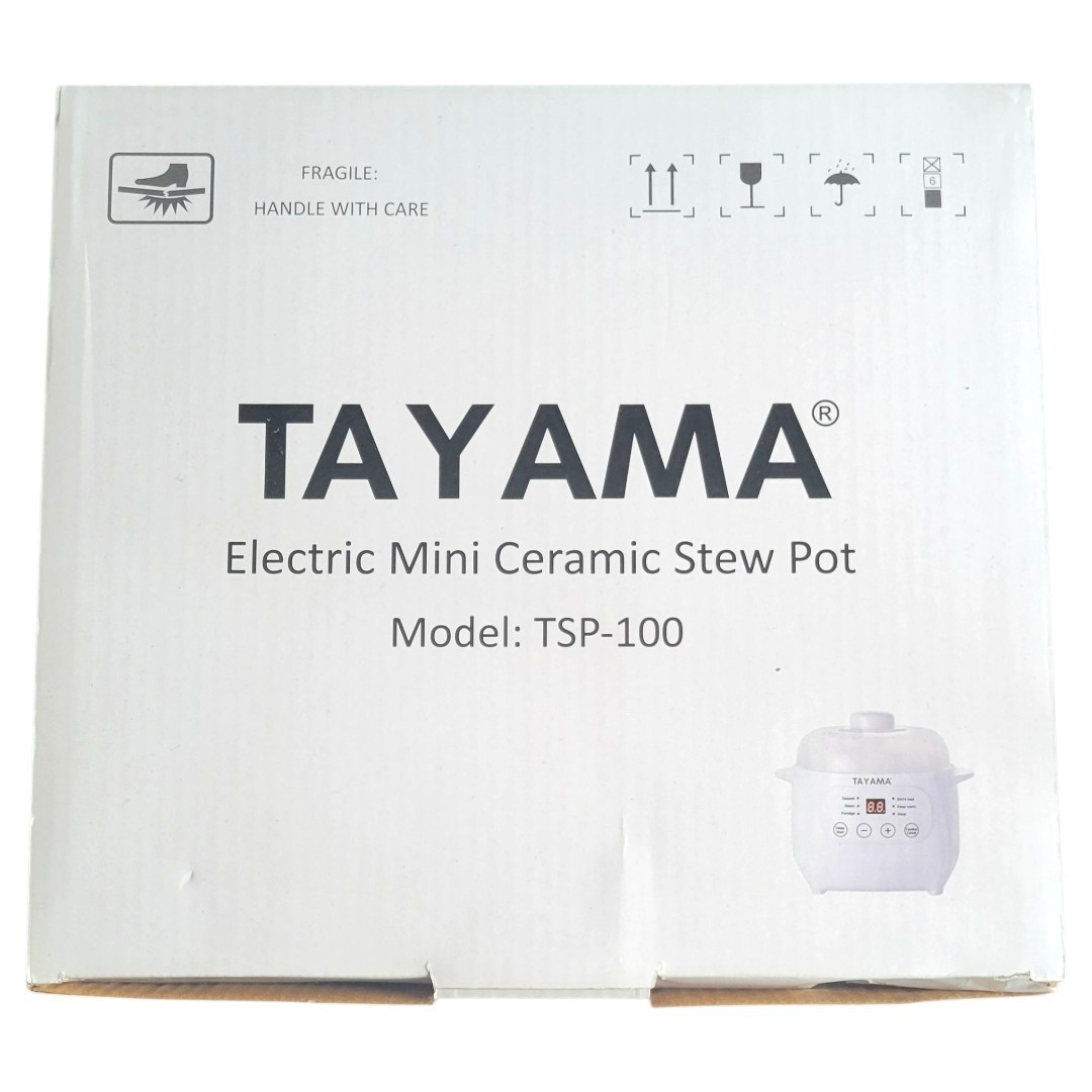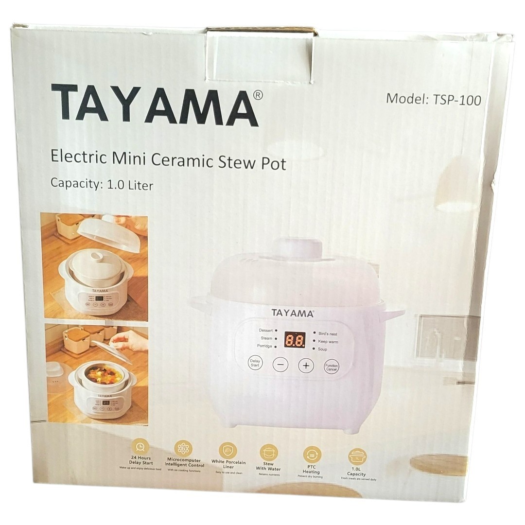 Cook your favorite herbal tonic and nourishing stews year round with this Tayama Mini Electric Ceramic Stew Pot. It is compact and combines traditional cooking technology with modern small kitchen appliance design. It operates by transferring heat slowly and evenly to the food contents in the porcelain stew pot via steam and water which helps retain the natural flavors and nutrition of the food. Preset functions include: Dessert, Steam, Porridge, Bird's Nest, Keep warm, Soup, and adjustable timer feature. Includes high quality ceramic porcelain stew pot and lid, transparent lid for easy viewing. Overheat and auto shut-off protection. Automatically switches to keep warm mode. Uses PTC to heat, power reduces when water is low Capacity: 1 Qt. or 1.0 L.