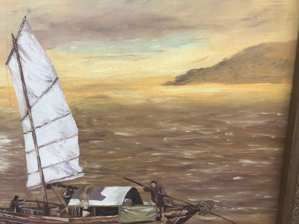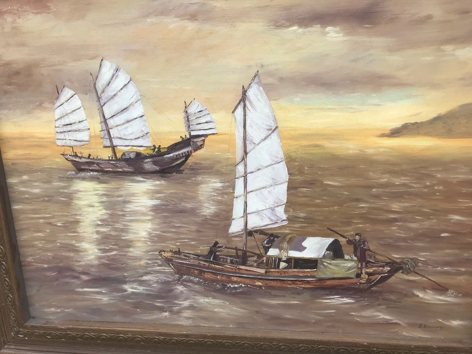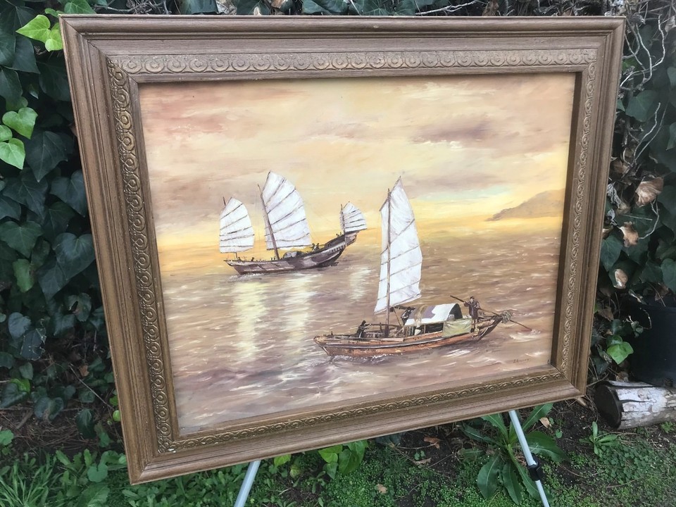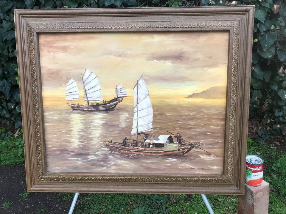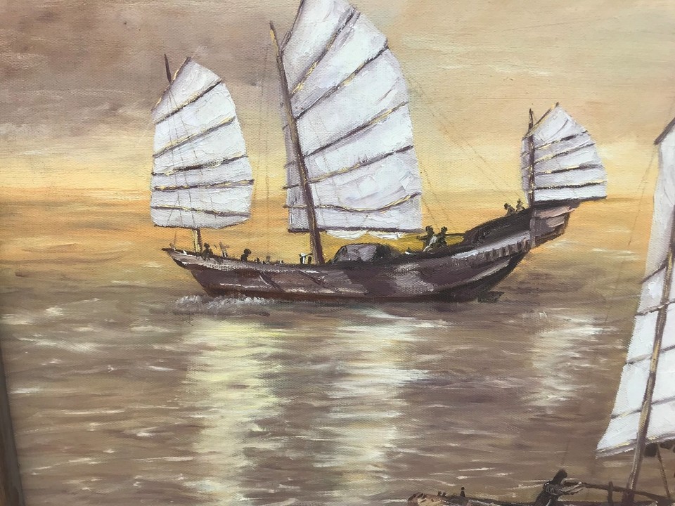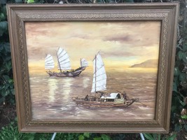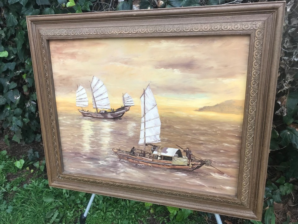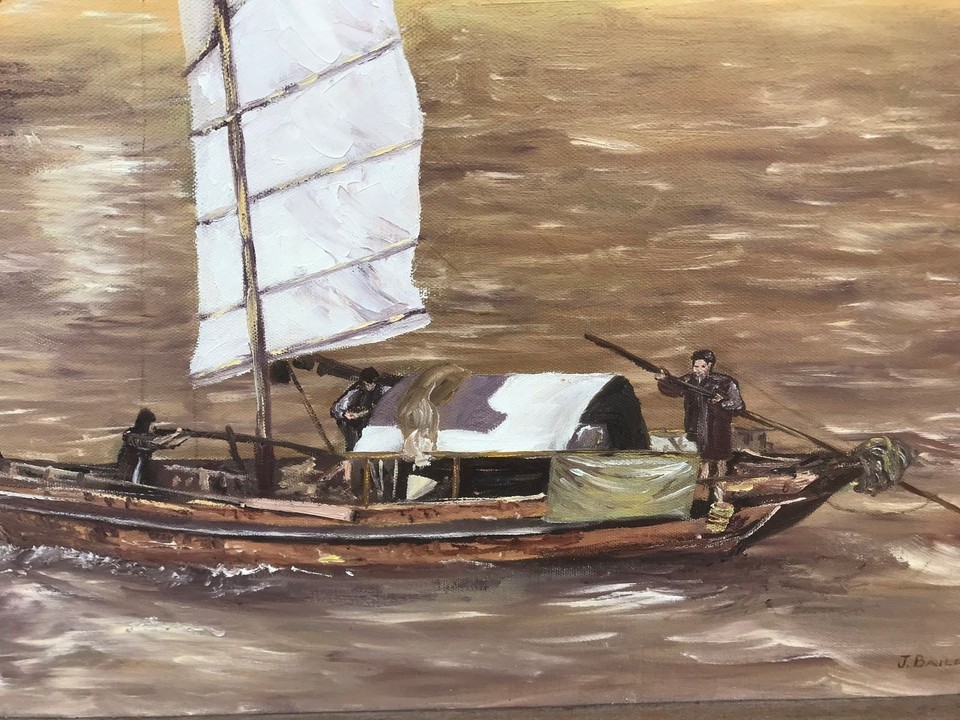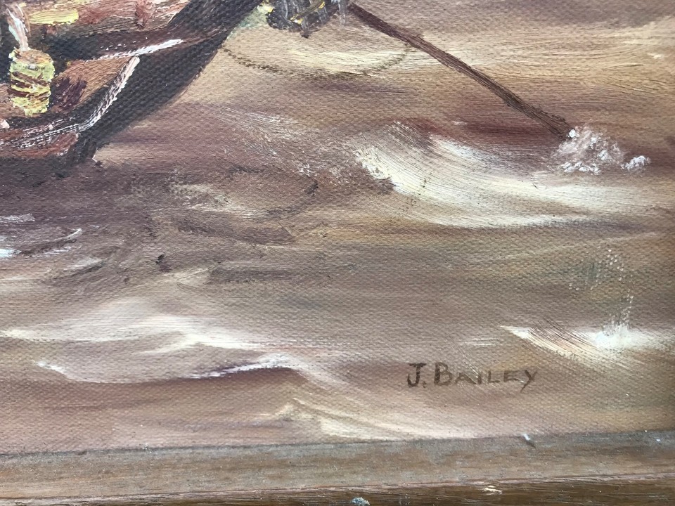 J BAILEY Original 1950s MID CENTURY MODERN HARBOR SEASCAPE VINTAGE OIL CANVAS