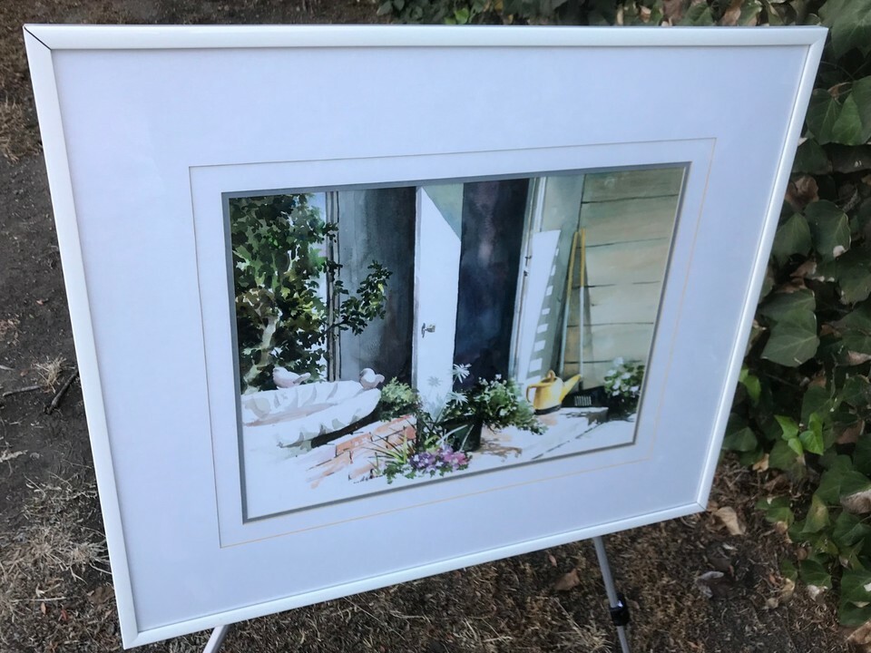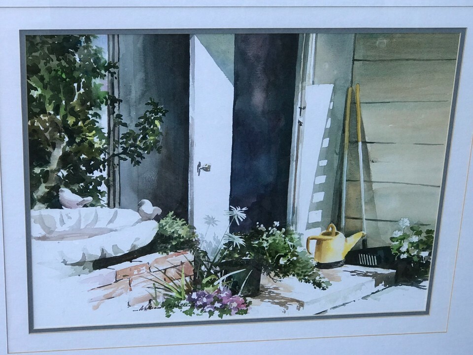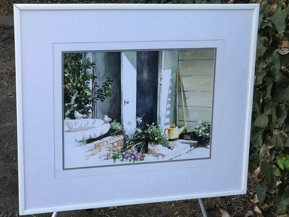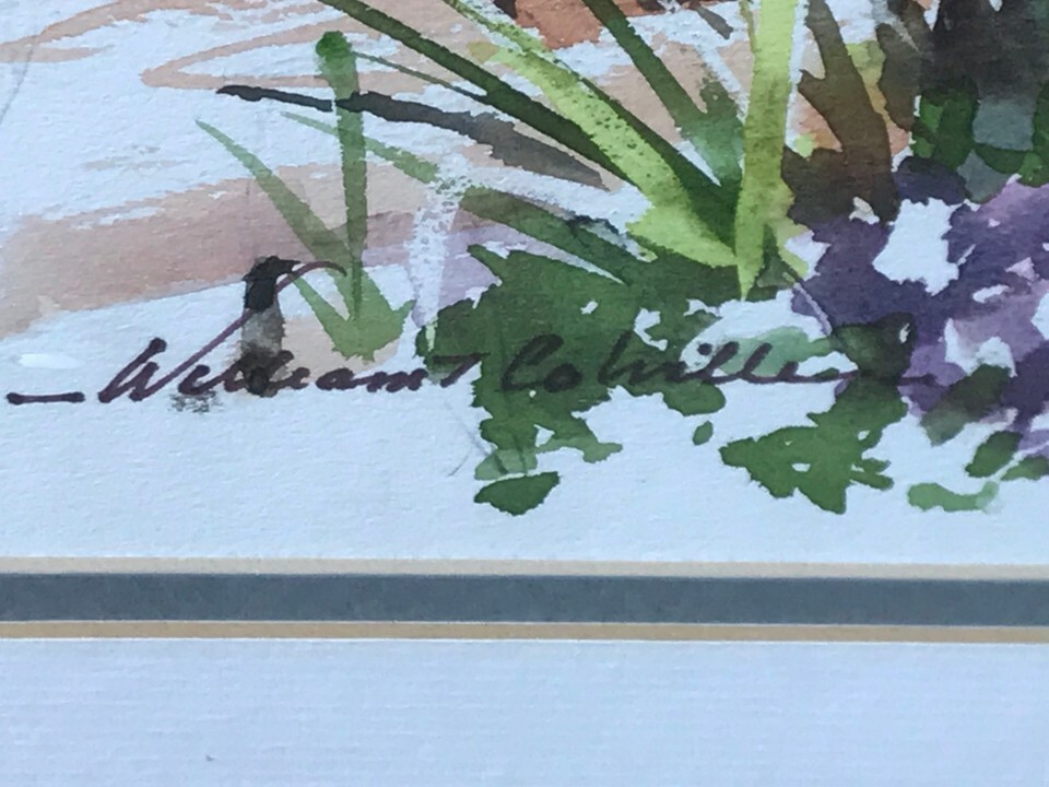 Bill and Sunny in the garden of Bill's Home Bill's prolific work from shows and commissions transforms landscapes and architecture into magical settings. His watercolors are filled with his trademark generous use of color and ingenious eye catching areas of light. His ability to highlight the intricate details of roofs, windows, gates, flowers and lush vegetation captures the allure of each subject. It has become a status symbol for Santa Barbarans to have their homes depicted by Bill. John Travolta, Kenny Loggins and other celebraties have William Colville paintings of their homes. With a practiced eye he was able to seize the exact perspective the client desired of the home or garden he is portraying. "I enjoy finding the special viewpoint that envisions the warmth, quality and spirit that my clients see in their hearts when they ask me to paint their homes," he explained. "Sometimes it is a whole vista and other times it can be displayed by painting an archway or garden path and showing only a special portion of the house." He was able to work from photos or en plein aire, traveling to the site or working in his studio with subjects from all over the world.