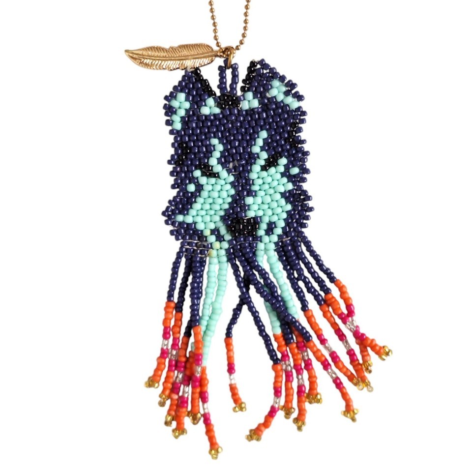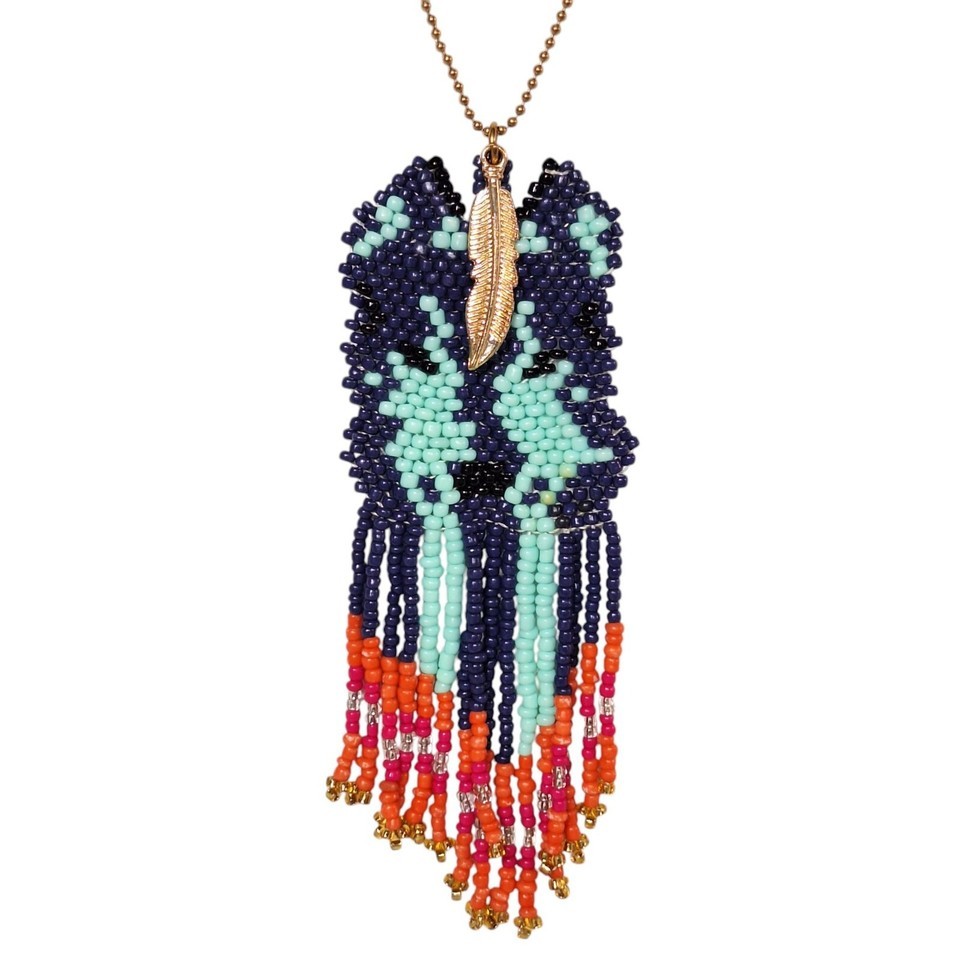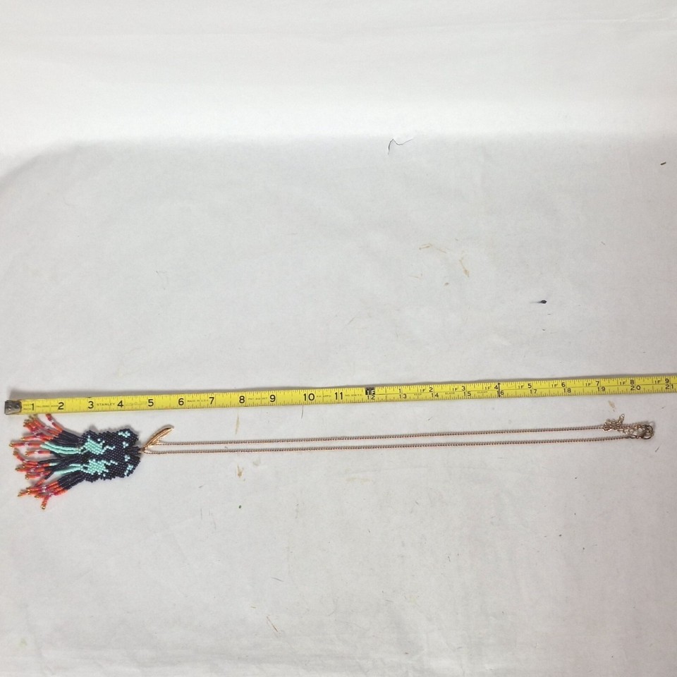 Vintage Multicolor Seed Beads Indian Tribal Necklace Gold Tone Feather Jewelry