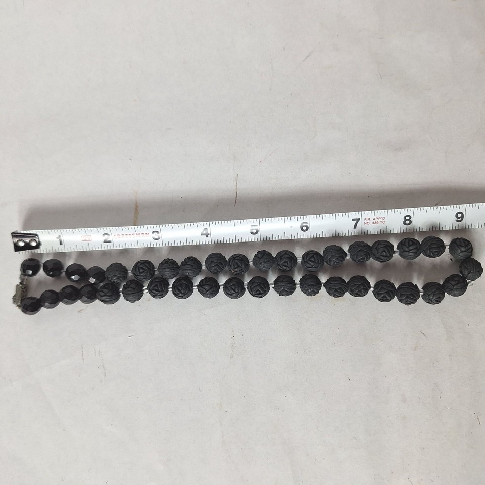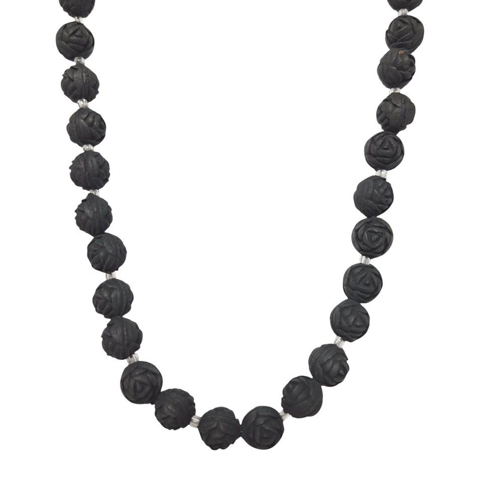 Vintage Black Carved Chunky Round Rose Beads Floral Necklace Costume Jewelry