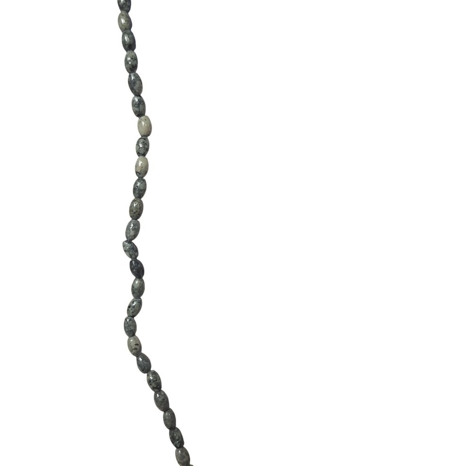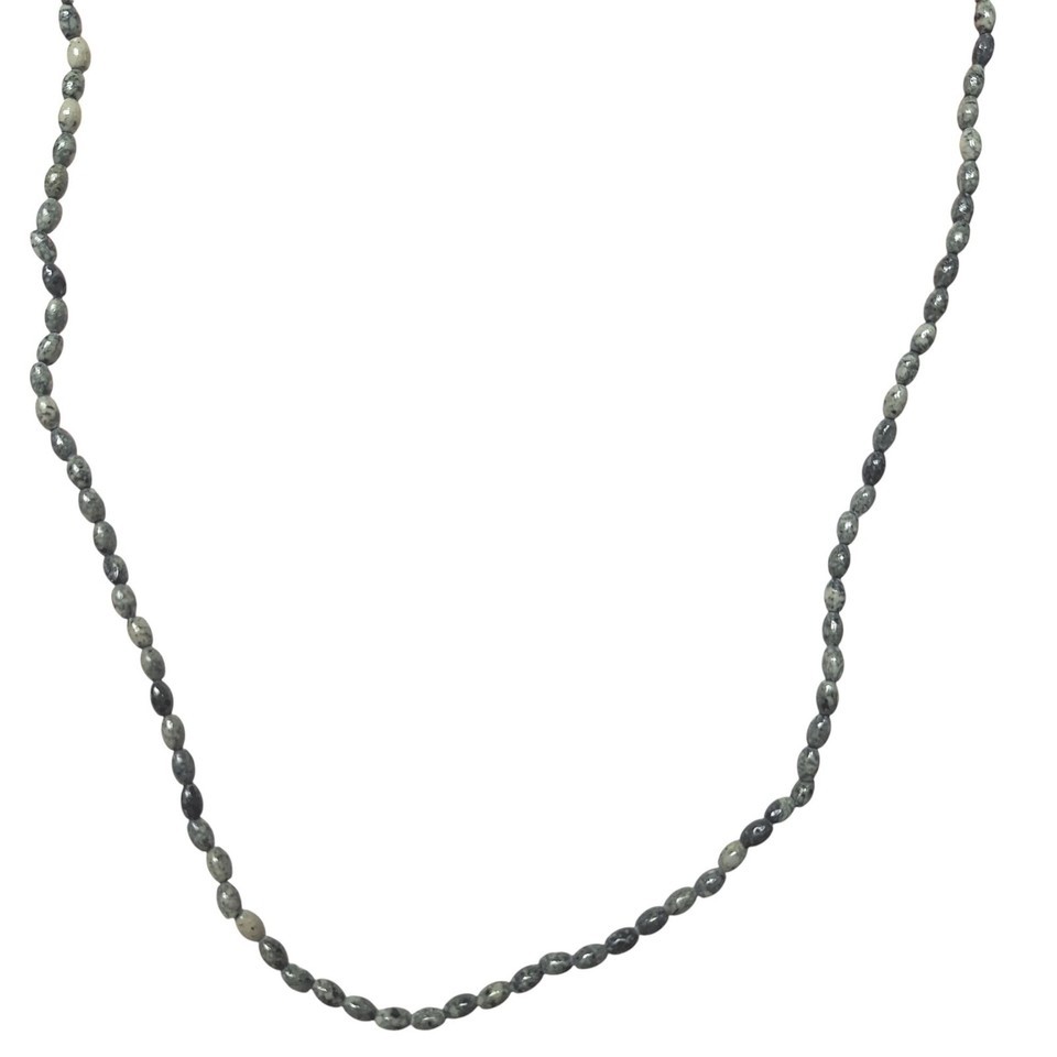 This handcrafted 17 inch necklace features polished jasper beads in shades of gray and black, offering a natural and elegant aesthetic.