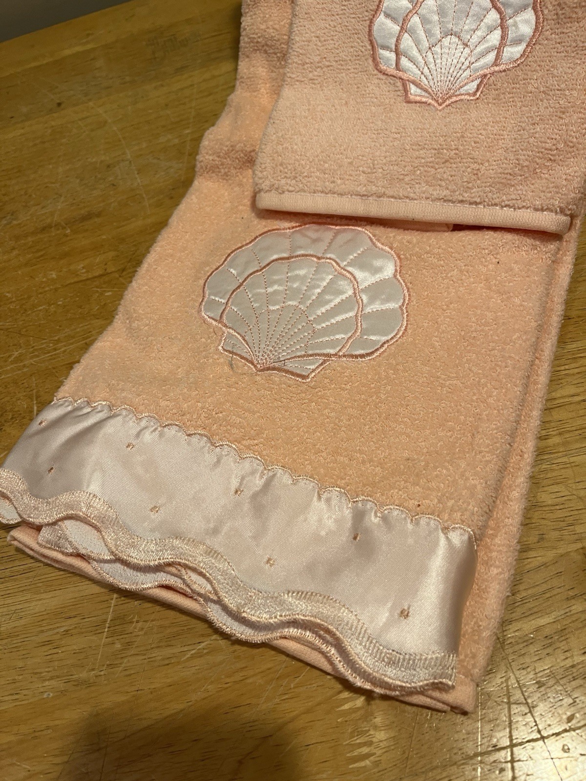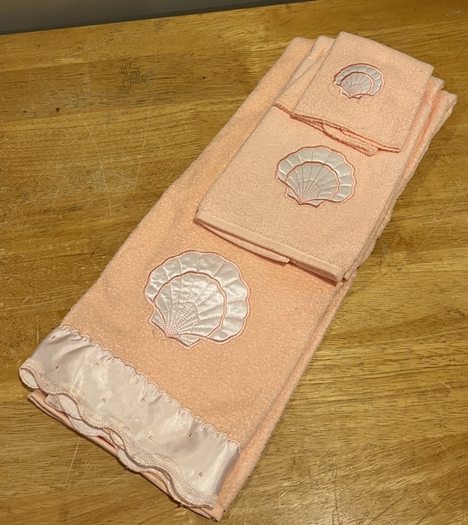 Vtg 3 Pc Cannon Peach Sea Shell Embroidered Bathroom Towel Set Bath/Hand/Wash