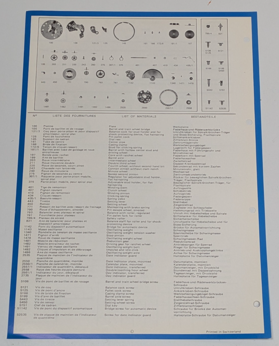 BETTLACH Roskopf Movement Cal 8155 8157 Technical Bulletin Parts Diagram List