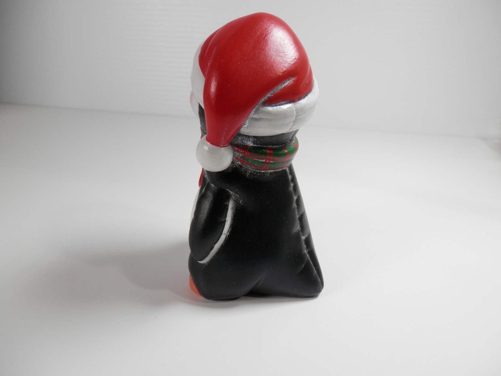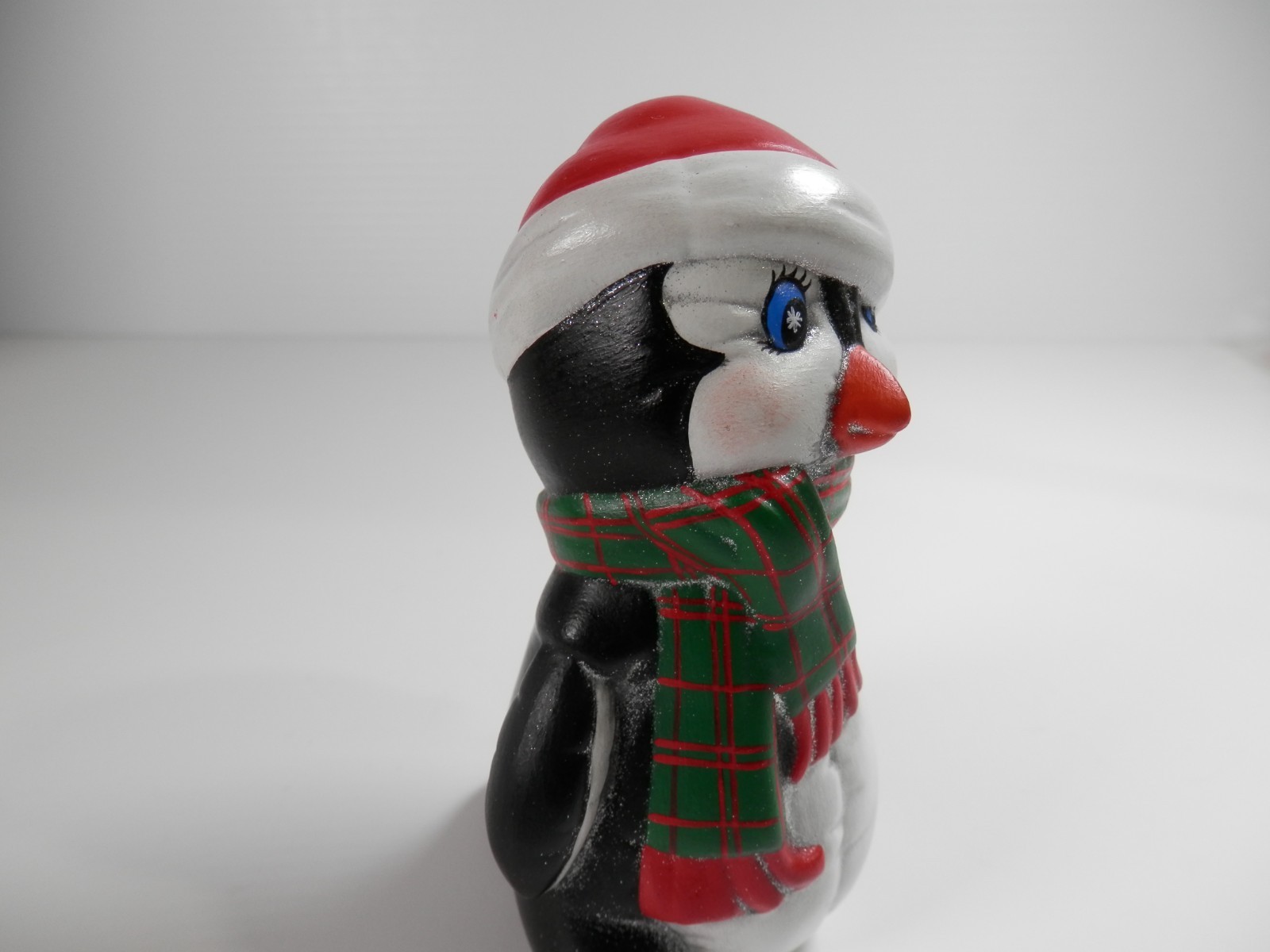 Vtg Hand Painted Ceramic Penguin w/ Santa Hat Plaid Scarf Figure Holiday 1980s