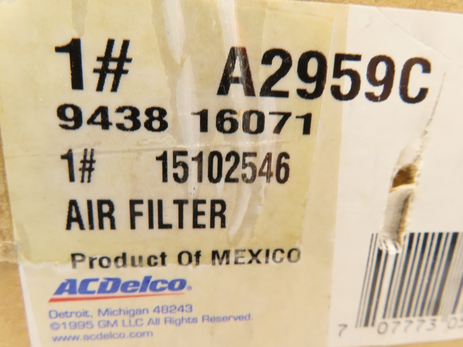 GM 15102546 Air Filter Element A2959C General Motors