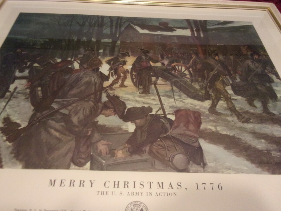 BEAUTIFUL ILLUSTRATION OF "MERRY CHRISTMAS" THE ARMY IN ACTION IN WEATHERED WHITE FRAME GENERAL GEORGE WASHINGTON