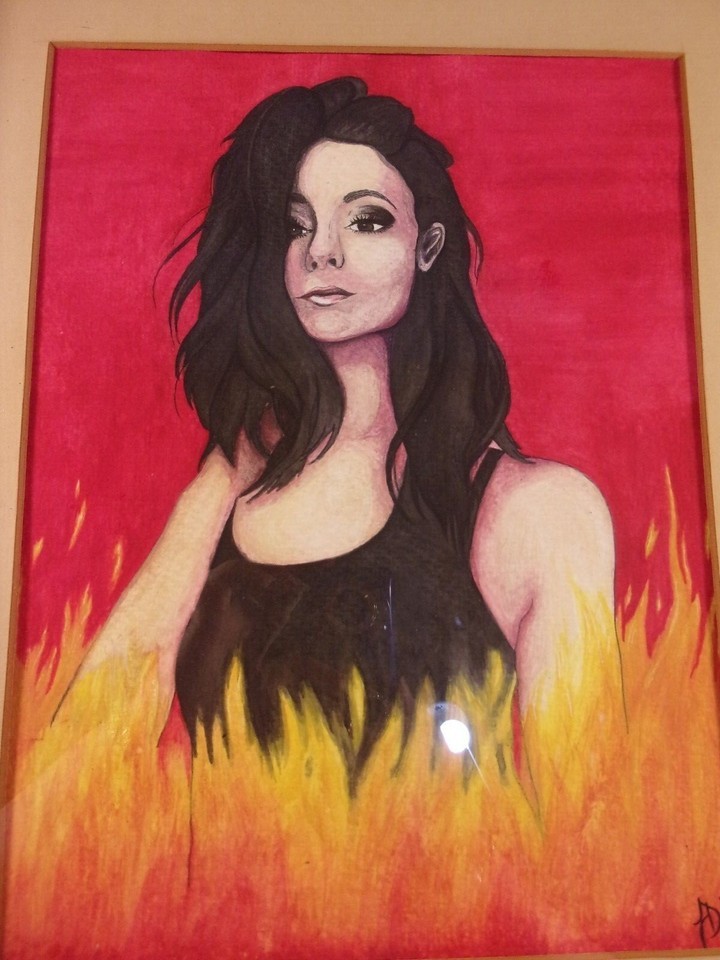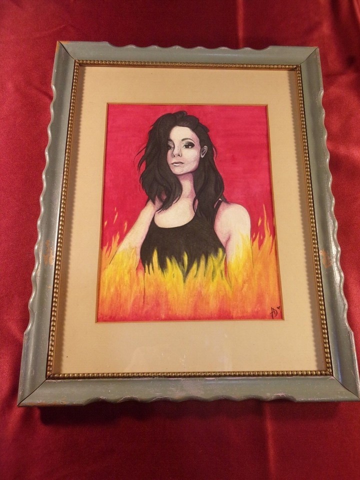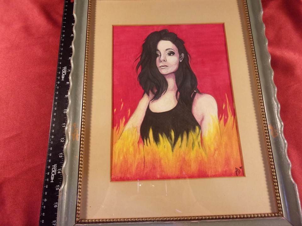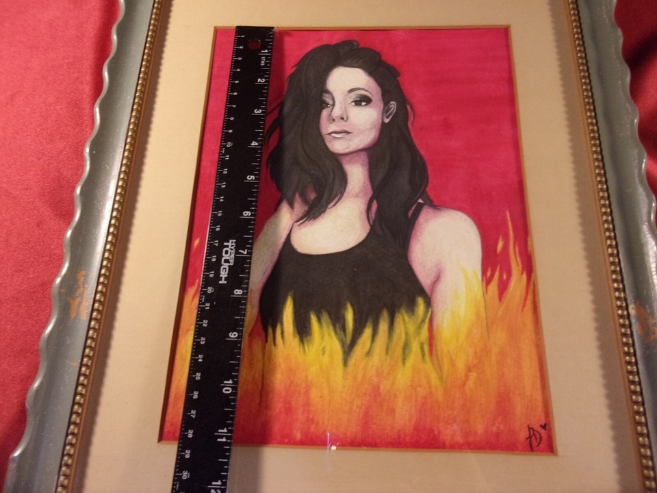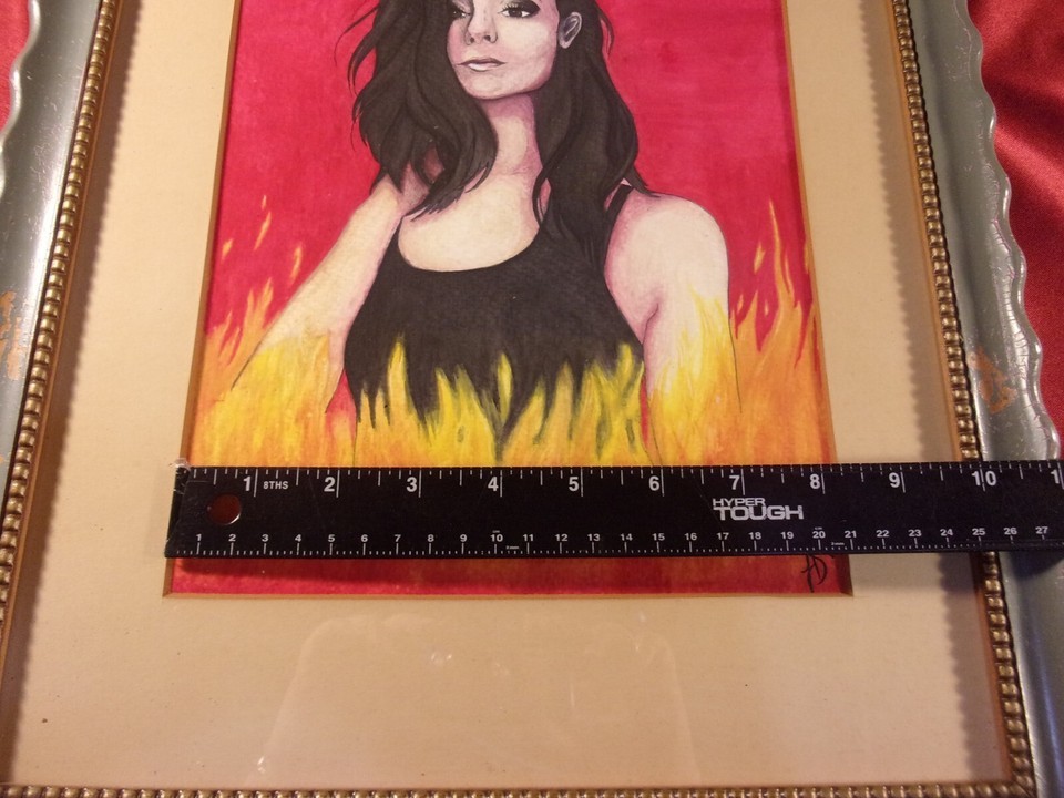 ORIGINAL ARTWORK BY JAY KAT D IN VINTAGE FRAME GIRL IN FLAMES SELF PORTRAIT 14" X 18"