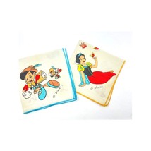 Both handkerchiefs are crafted from soft cotton, showcasing vibrant colors and intricate details. They are in excellent vintage condition, with minimal signs of wear, preserving their nostalgic appeal. These handkerchiefs are perfect for collectors of Disney memorabilia or as charming decorative pieces.