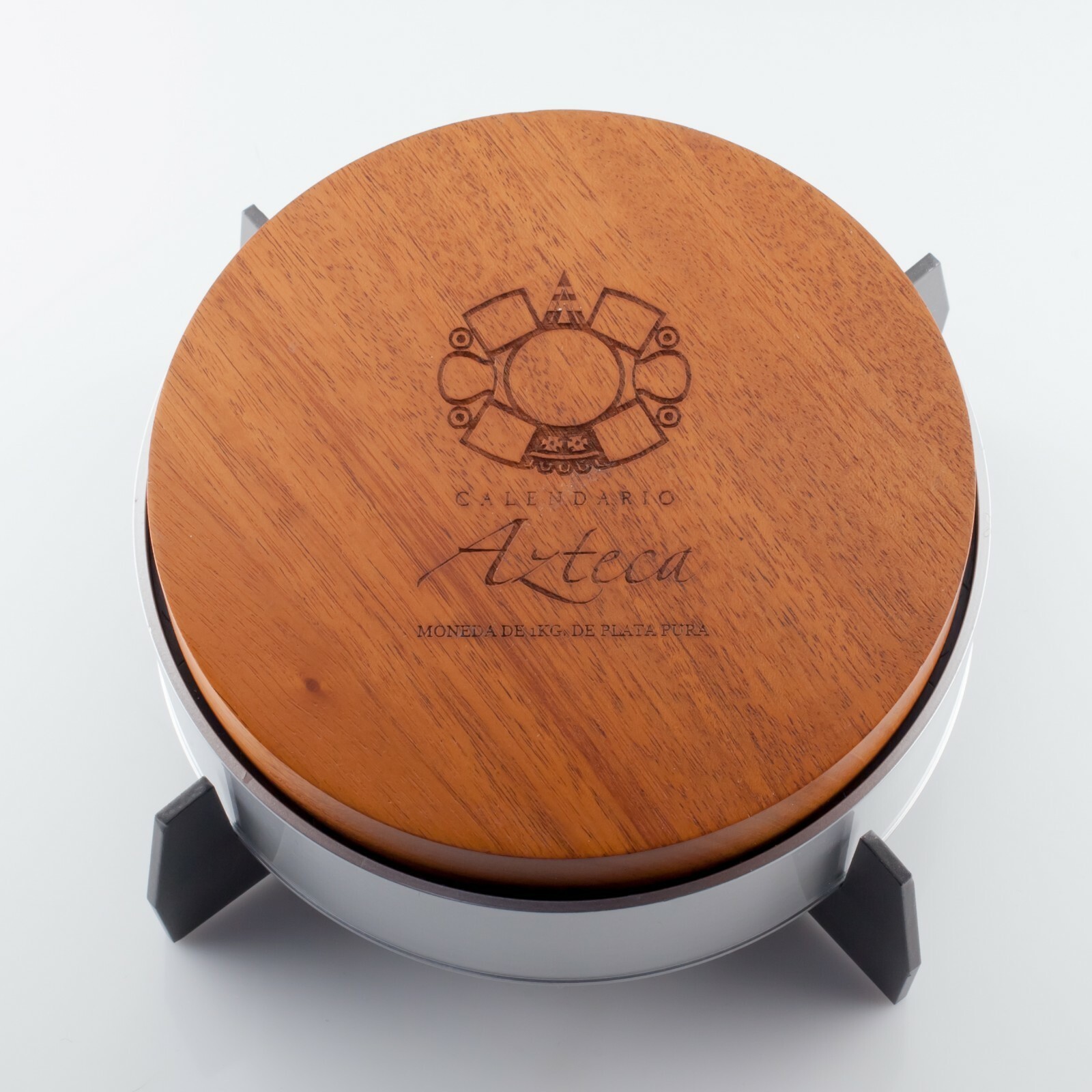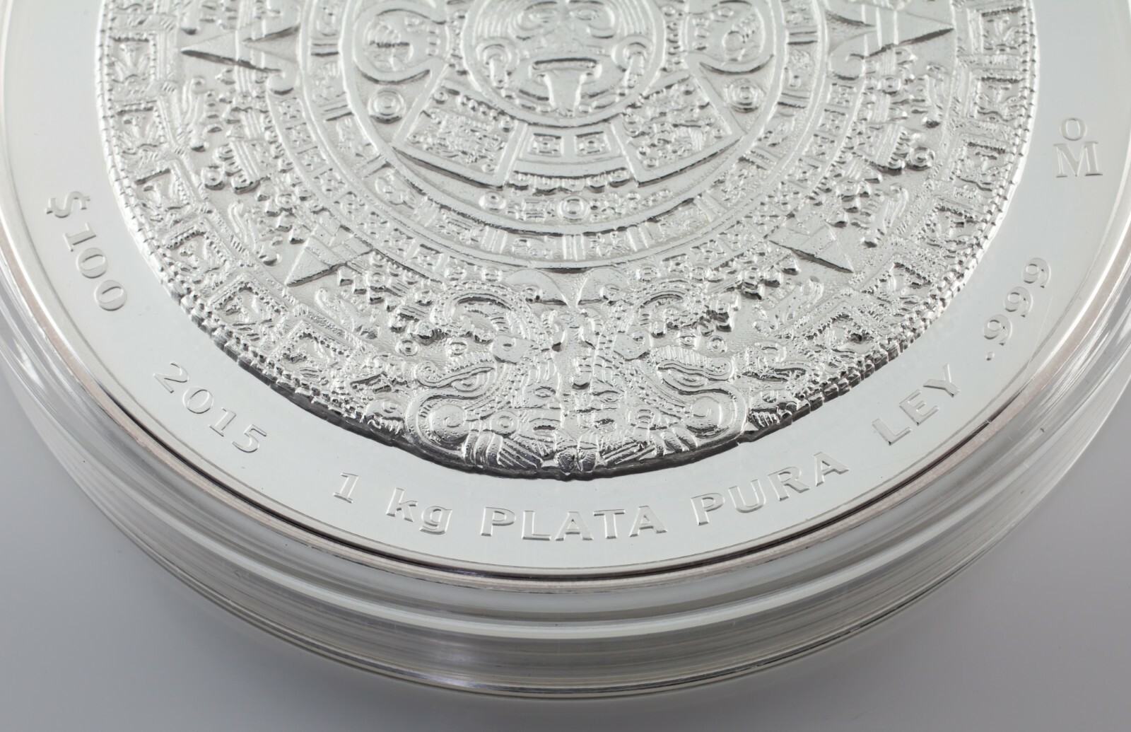 Rückseite: In der Mitte der Aztekenkalender oder der Sonnenstein. Im oberen Teil befindet sich parallel zum Münzrahmen und folgt der Kante die Legende "Kalender Azteca" (Aztec -Kalender). Rechts befindet sich die Münzmarke von Casa de Moneda de Mexiko, wahrend auf der linken Seite das "$" -Schild ist, gefolgt von der Nummer "100". Auf der linken Seite, parallel zum und folgen der Kante, befindet sich das Jahr des Meilens, gefolgt von der Legende "1 kg Plata Pura Ley .999" (1 kg reine Silberfeinheit .999). Die Münzkante ist flach.