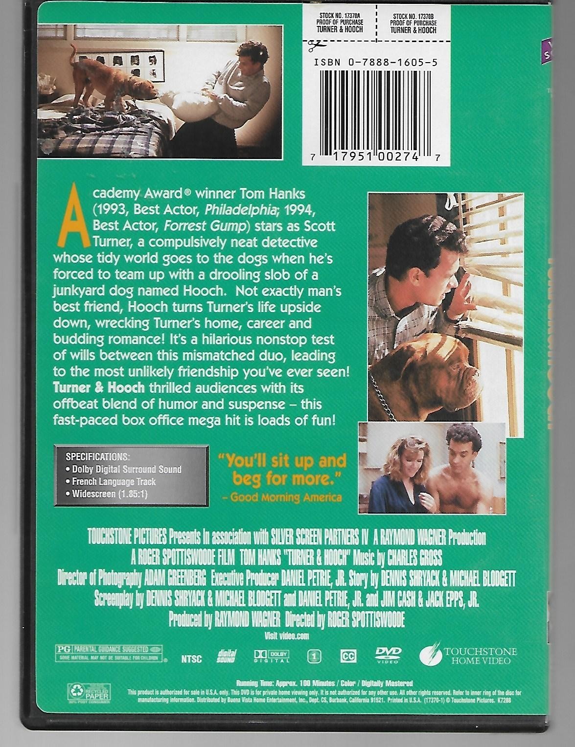 "Turner Hooch" is a comedy-action film directed by Roger Spottiswoode and starring Tom Hanks. The DVD format is NTSC, with a tall/DVD case and a PG rating. The movie, released in 1989 by Touchstone Pictures, runs for 100 minutes in widescreen format. The story follows the adventures of a hotel inspector and his mischievous Australian Shepherd as they team up to solve mysteries in a charming and entertaining way. This classic film is sure to delight fans of Tom Hanks and comedy-adventure movies.