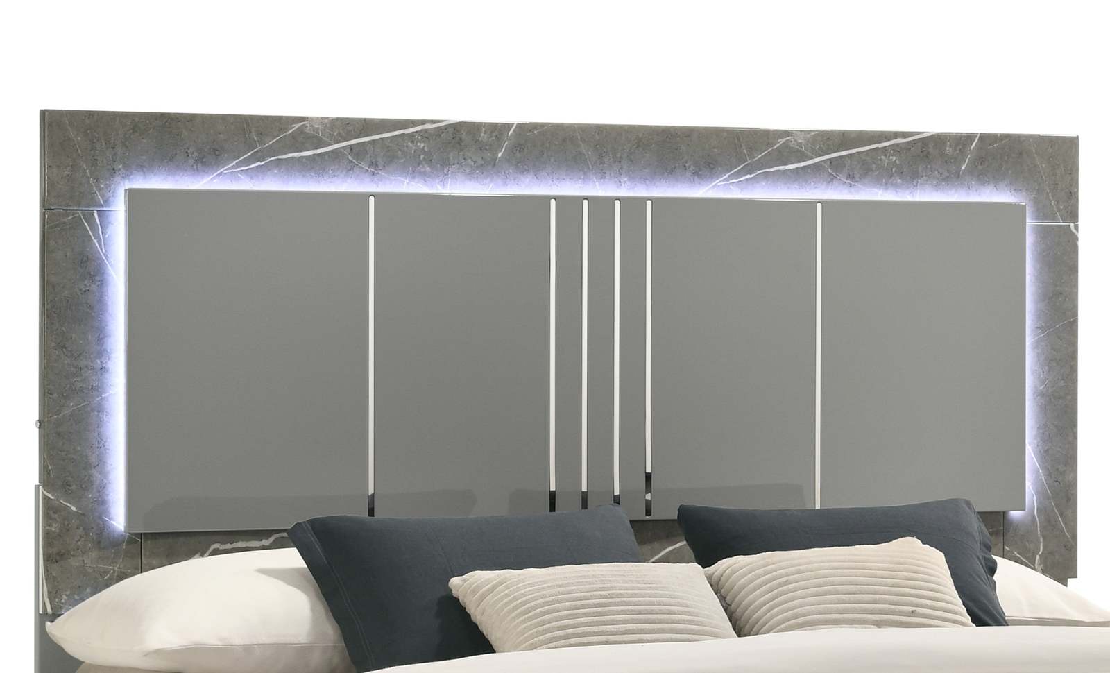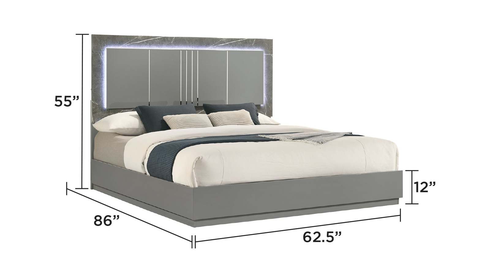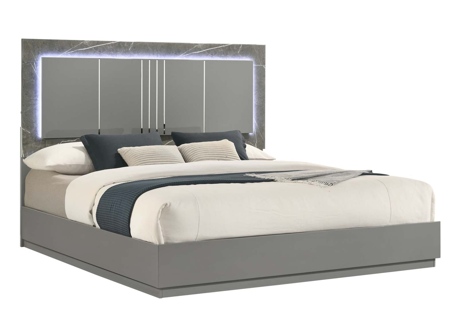Elara Queen Bed: Gray High-Gloss Marble & Lacquer Finish, LED Lights
