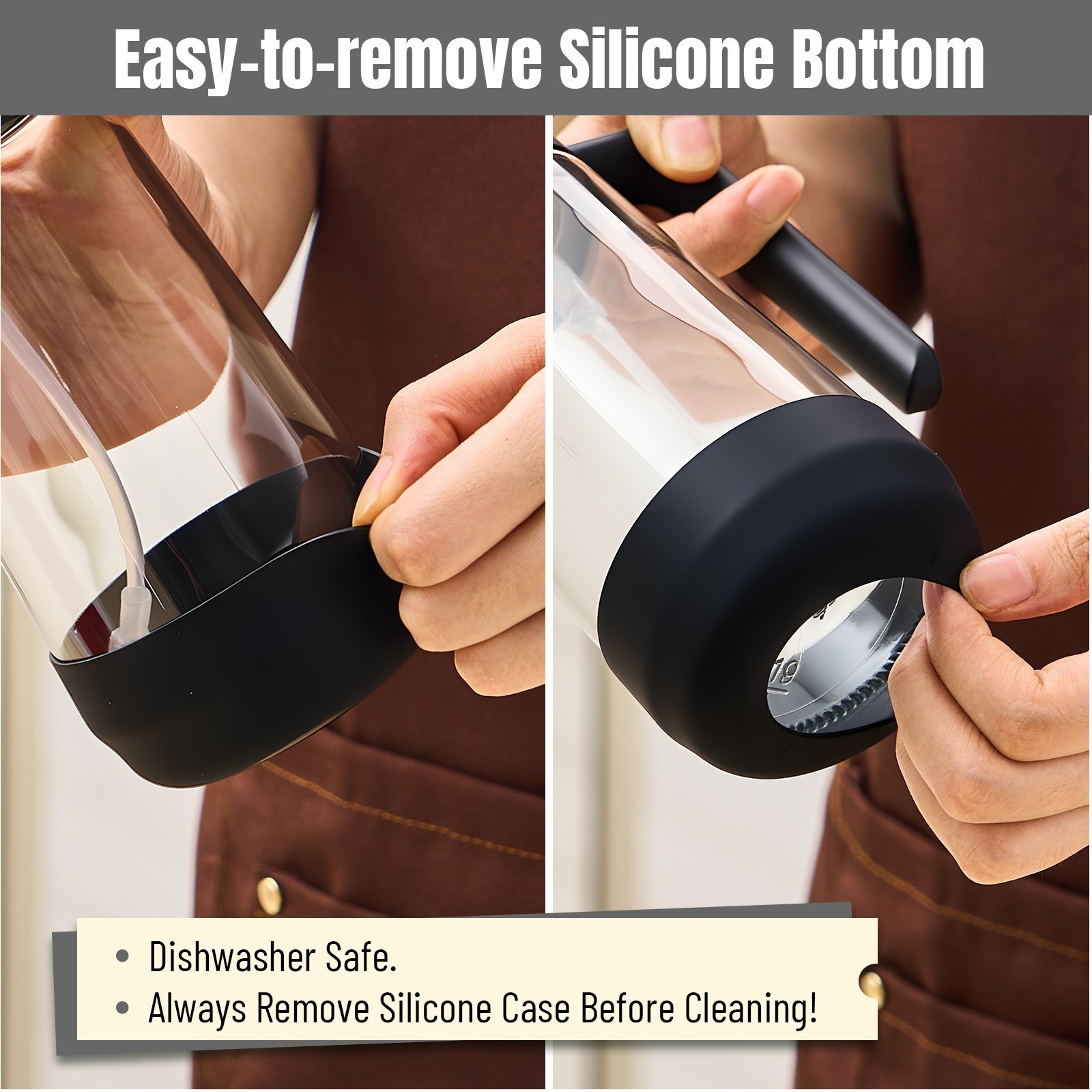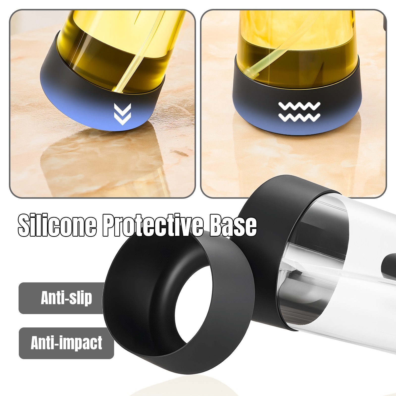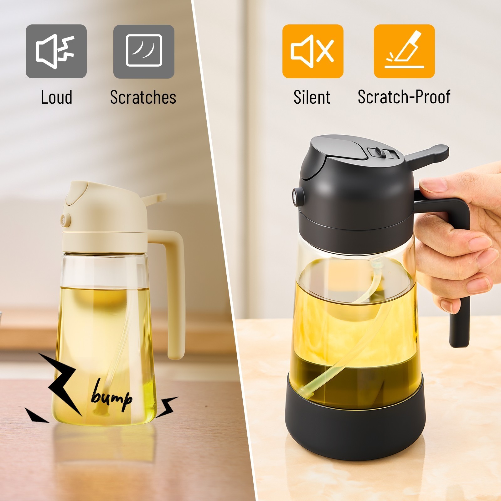 ?Upgraded Non-Slip Noise-Reducing Base?Exclusive new upgrade! Features a detachable silicone sleeve at the base. The oil dispenser bottle provides superior stability, preventing slips and scratches on countertops, tables, or smooth glass stovetops. The base also significantly reduces clattering noise when placed down, offering a quieter cooking experience. The sleeve is easily removable for thorough cleaning without any hard-to-reach areas.
