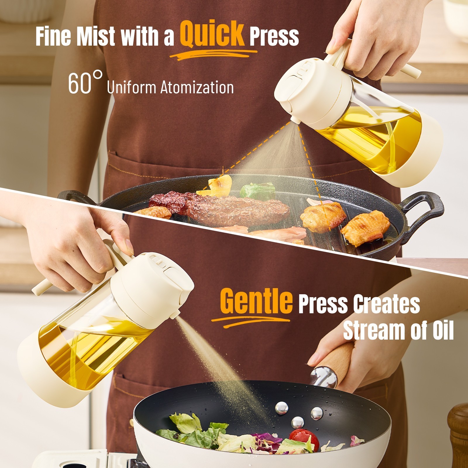 ?2-in-1 Spray Pour Functionality?This innovative oil dispenser combines both spraying and pouring functions into one sleek bottle. With its built-in dual-purpose nozzle, you can switch between a fine mist spray and a controlled stream with a simple twist. The olive oil sprayer is perfect for various cooking needs, from frying and sauteing to baking and salad dressing, making it an essential smart tool for any modern kitchen.