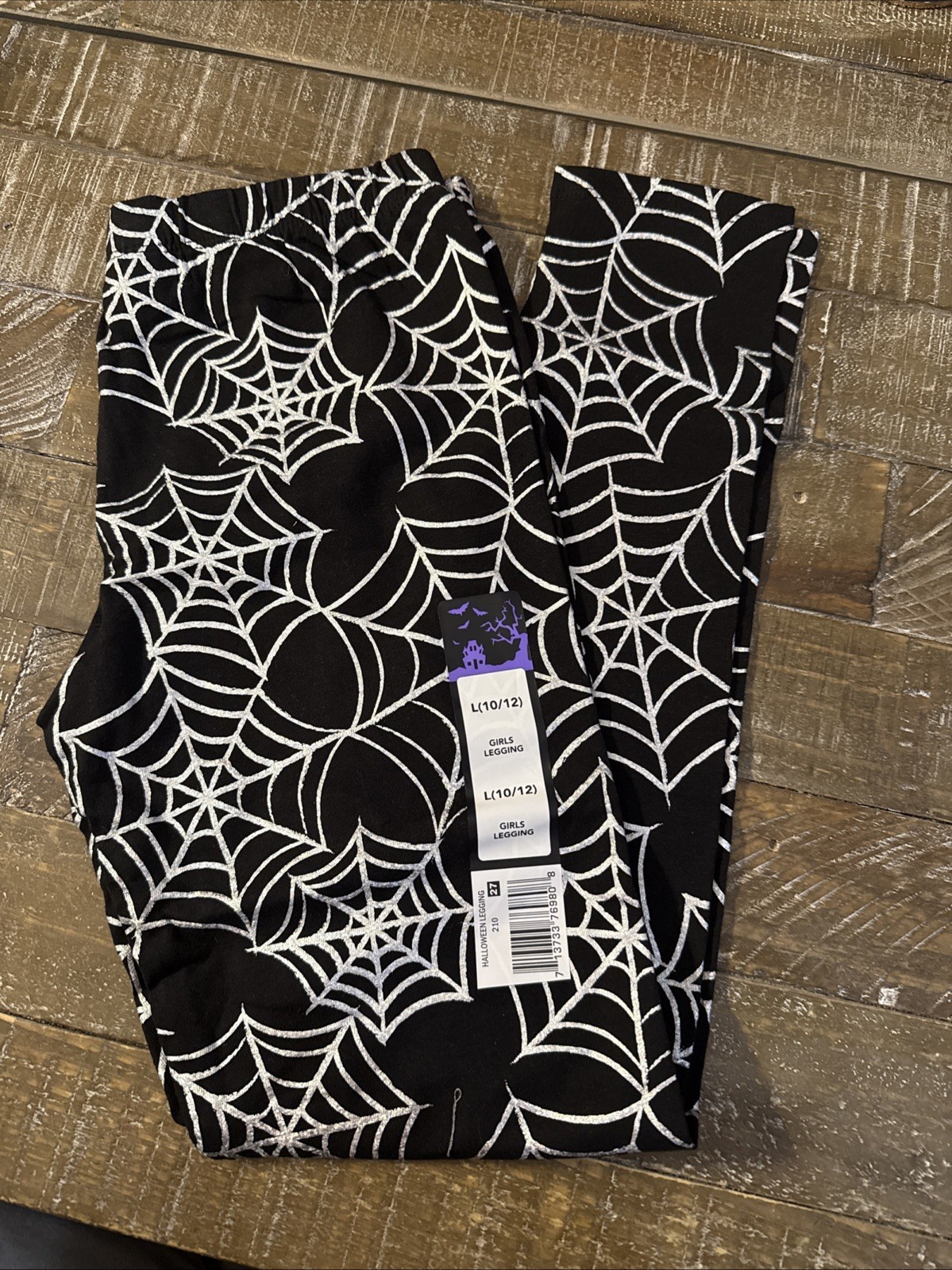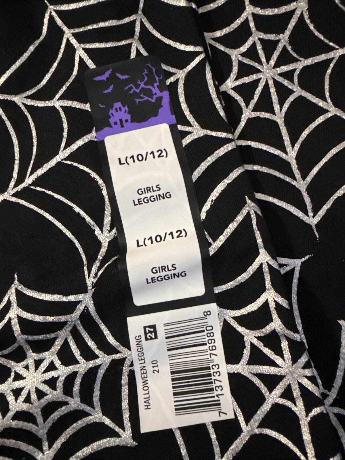 These new black leggings with a silver geometric spider pattern are perfect for Halloween and beyond! Made from a comfortable cotton blend fabric, these leggings feature an elastic waist for a secure and adjustable fit. The full-length design and reflective accents make them ideal for various activities like play, walking, or dance. Easy to care for with machine washable instructions, these leggings are a stylish and practical addition to any girl's wardrobe, especially in size 10/12. The haunted house symbol brand brings a spooky touch to these fun and festive leggings.