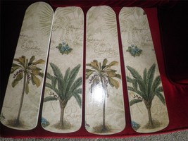 Brand new in the box 42" flushmount ceiling fan with single school house style light fixture attached. Only the blades have been removed to have tropical palm tree and gold script motif graphics applied. Blades are then selaed with a polyacrylic to protect the finish