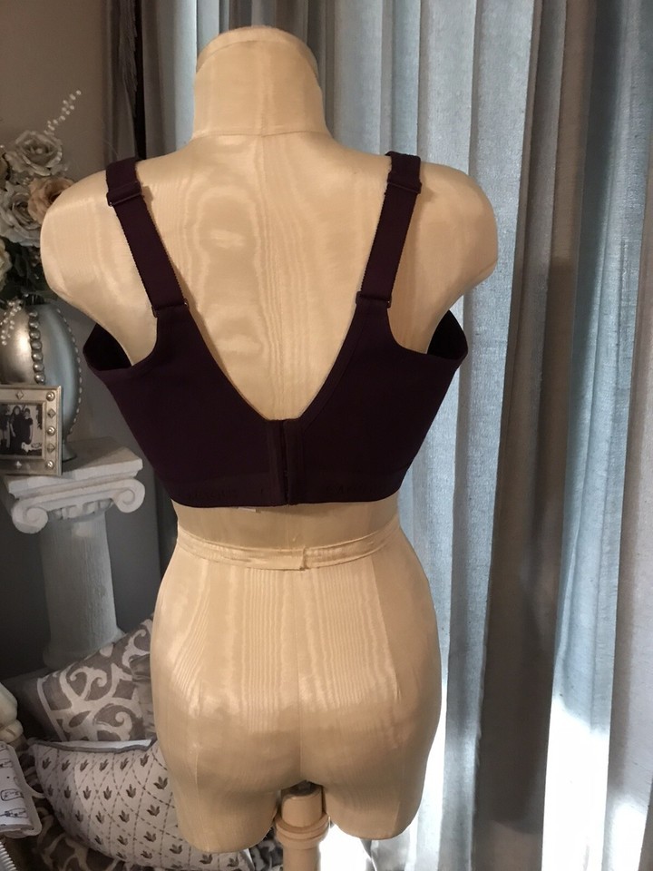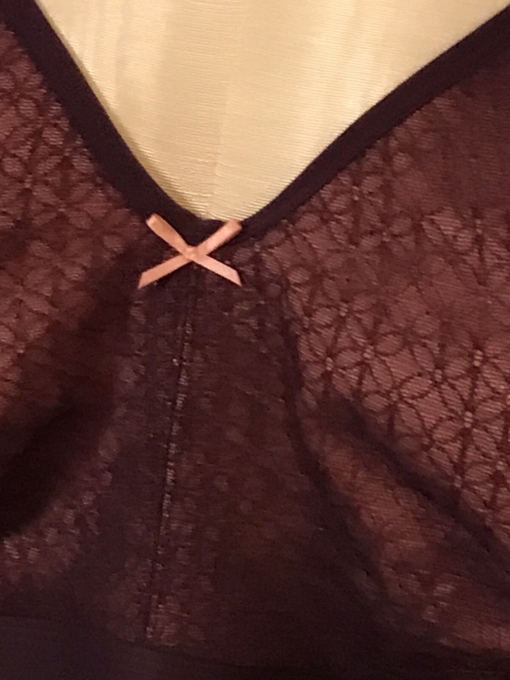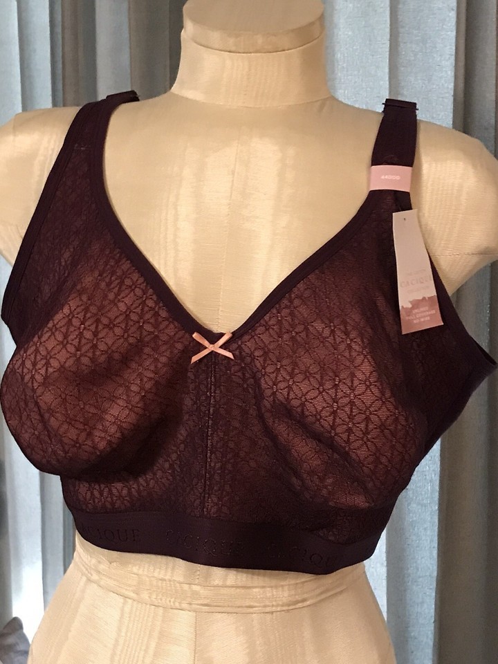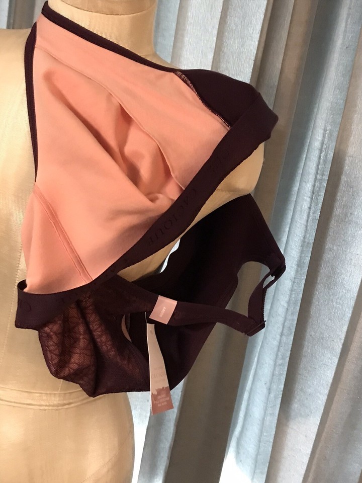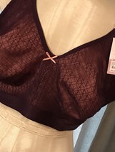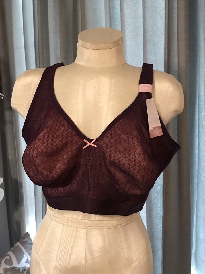 From Lane Bryant Cacique Collection bra with lace overlay on the front. Rich burgundy wine with red cotton lining. Swiss dot mesh overlay with tiny red glittery bow accent. Gold glitter accent on elastic band all around. Style from a few years ago. No longer sold. Gorgeous bra
