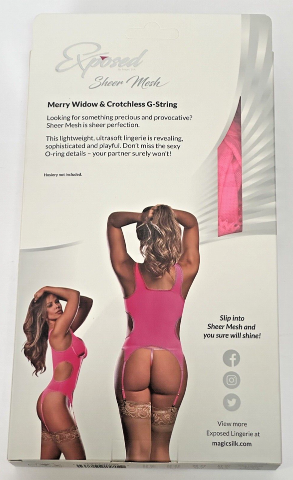 From the Exposed by Magic Silk Collection, this style includes: A merry widow featuring a non-restrictive design, ribbon lacing details, adjustable garter straps with metal clips, cutout side accents, and a matching G-string featuring a crotchless design. 90% Nylon, 10% Spandex. Hand wash, cold. No Bleach. Dry flat.