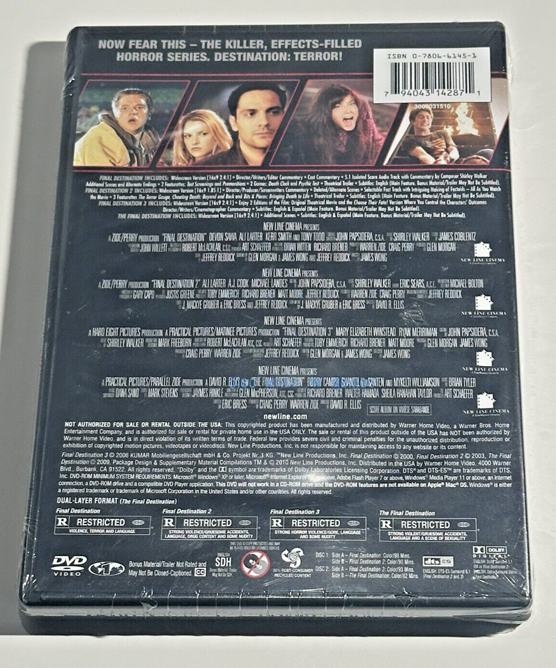 This DVD set includes four films from the Final Destination franchise, all of which are rated R and fall under the horror genre. The set is new and still sealed in its original packaging, ensuring that it has not been opened or used before. The films come from the New Line Home Video studio, known for producing top-quality horror movies.