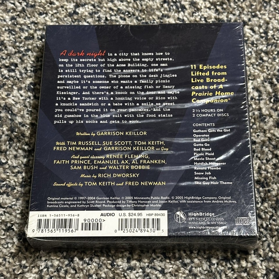 Dive into the whimsical world of "The Adventures of Guy Noir" by Garrison Keillor, available in a brand-new, sealed compact disc format (2 discs). Published in 2005 by Highbridge Company, this audiobook offers a delightful blend of humor and mystery, showcasing Keillor's unique storytelling prowess.