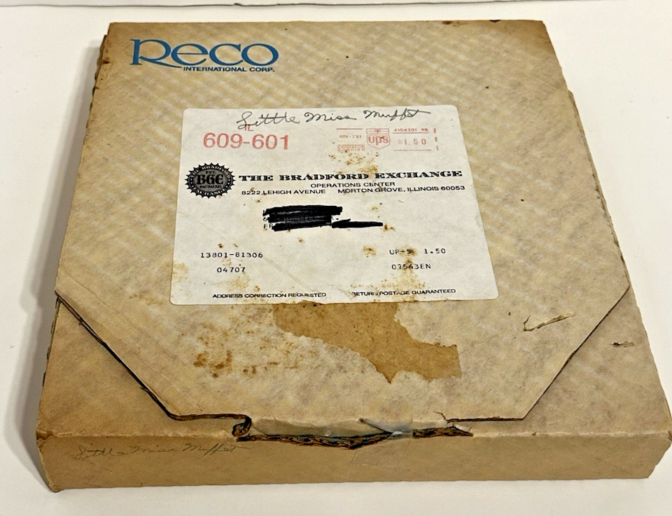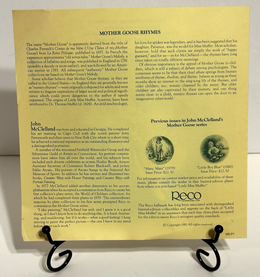 This vintage 1981 collector plate featuring Little Miss Muffet is the third issue in a series of Mother Goose plates. Produced by Reco/Bradex, this round ceramic/porcelain plate has a colorful design and a diameter of 8.5 inches. Perfect for collecting or displaying, this charming piece adds a touch of nostalgia to any decor. plate no. 11272, John McClelland, in original box, - due to age box does have wear, still in overall nice pre-owned vintage condition