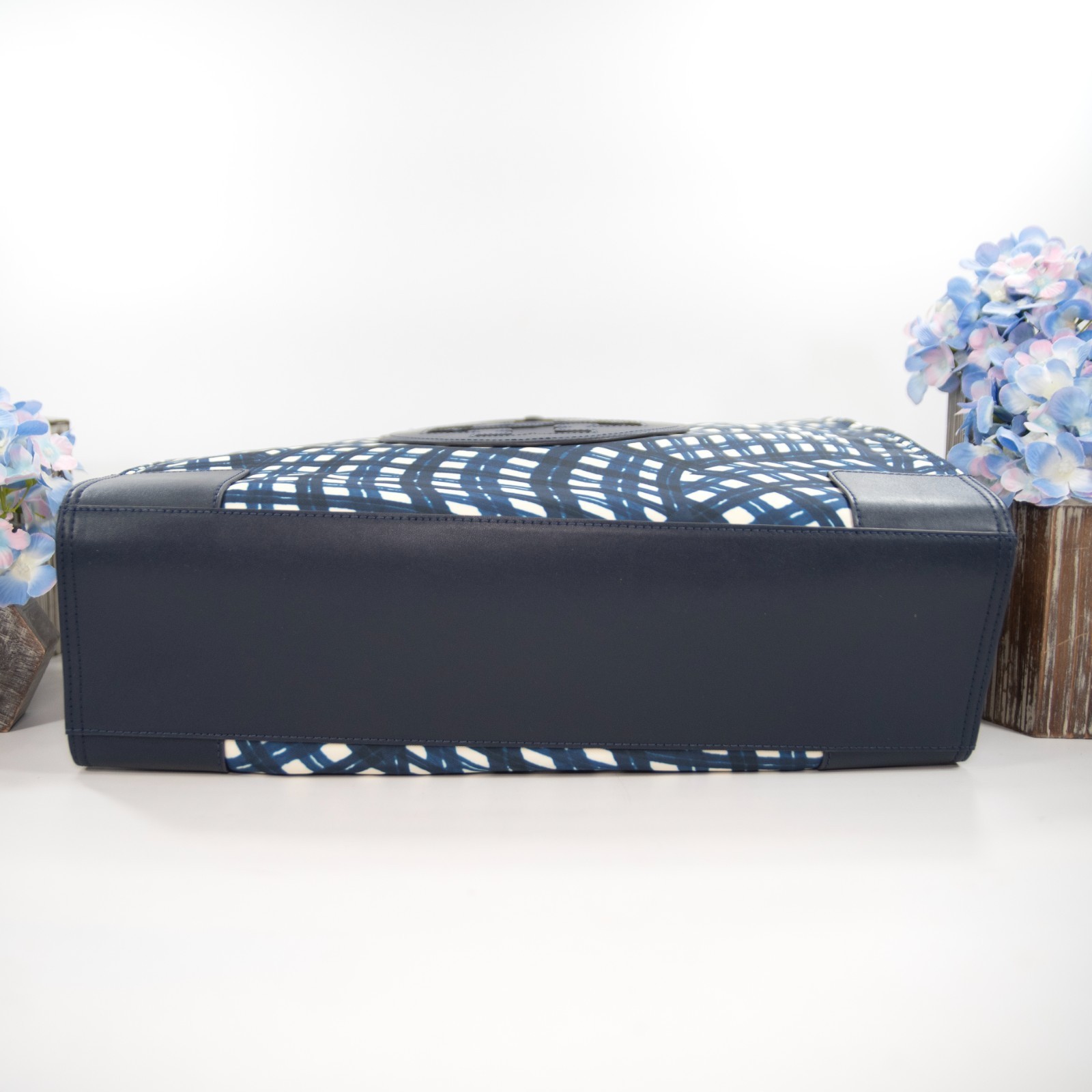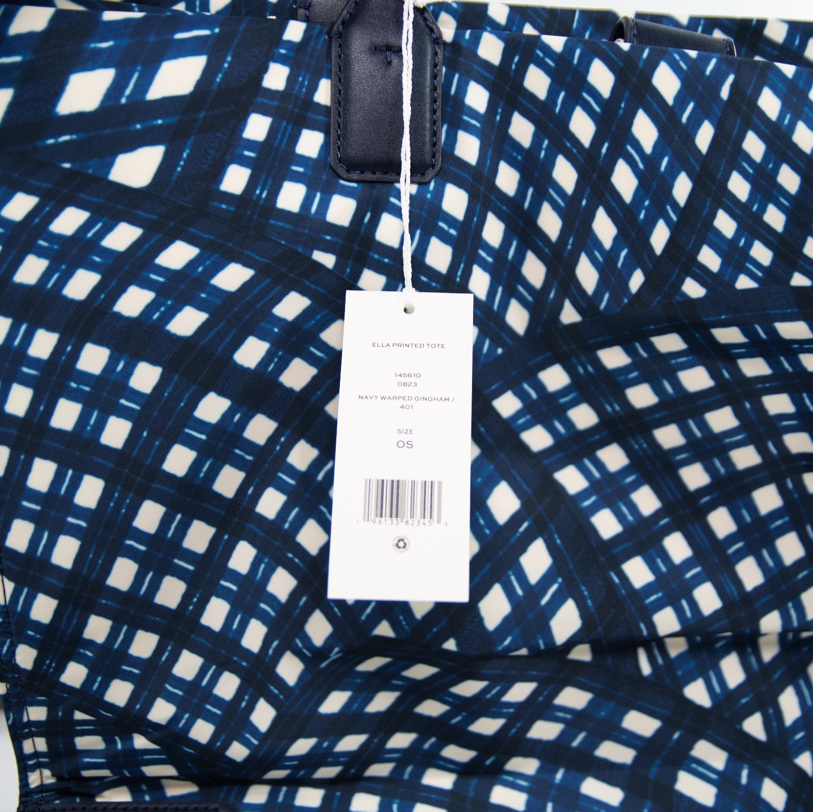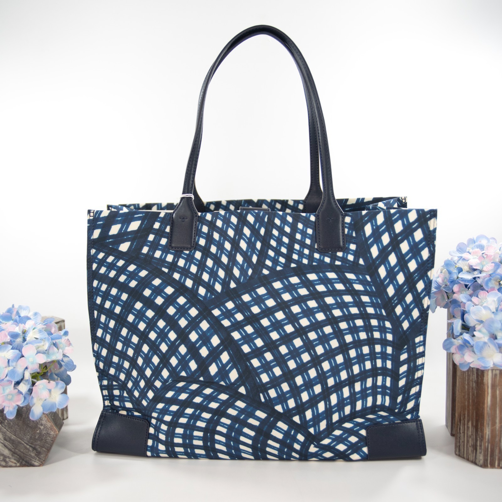 Tory Burch Ella Wavy Gingham Navy Nylon Natural Leather Large Tote Bag NWT