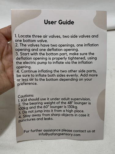 This is a brand new item, never inflated. Compression lounger chair for calming and relaxing for kids with sensory needs. Is a rich black, flocked pea pod for children. For ages 6-12. Comes with a inflator, different tips and air plugs as shown.
