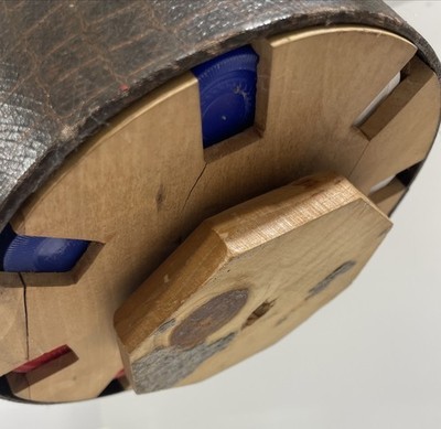 This product is a set of vintage poker chips made in the United States, accompanied by a wooden caddy and a round faux alligator case. The chips feature a design in red, white, and blue, making them a patriotic and collectible item for enthusiasts of casino games. The unique combination of vintage chips, wood caddy, and exotic case adds a touch of nostalgia and charm to any poker gaming experience.