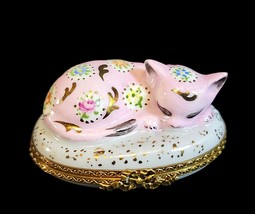 Limoges France Peint Main Trinket Box Pink Cat Sleeping Hand Painted SS Signed