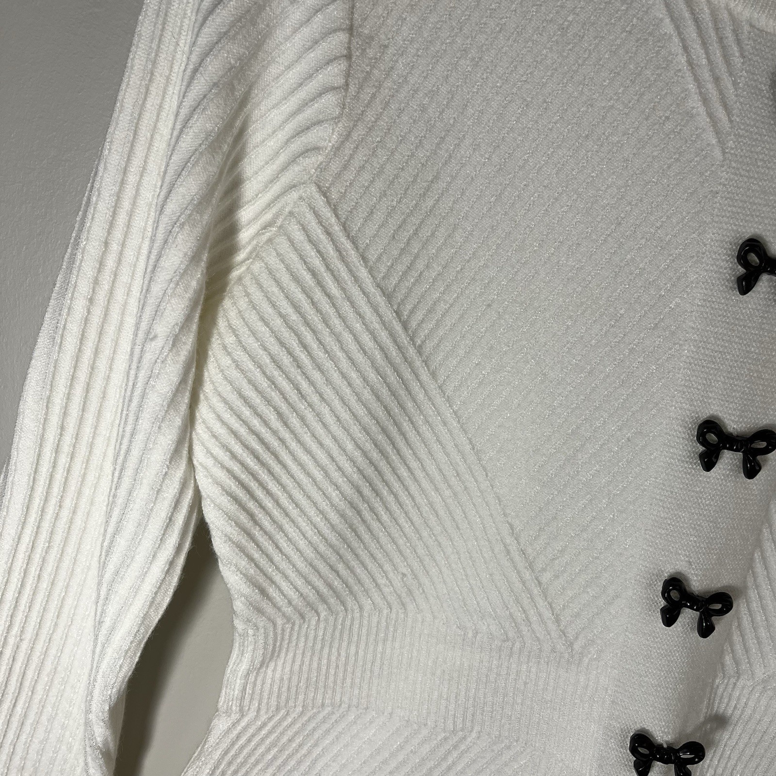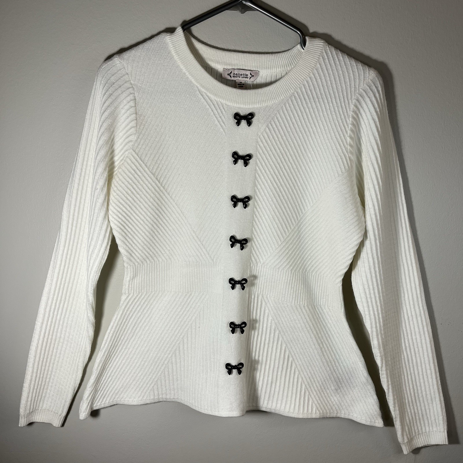 Nanette's peplum sweater features a chic and long sleeves, creating a stylish yet comfortable silhouette. The eye-catching bow detail adds a playful touch, while the asymmetric ribbing enhances its contemporary design.