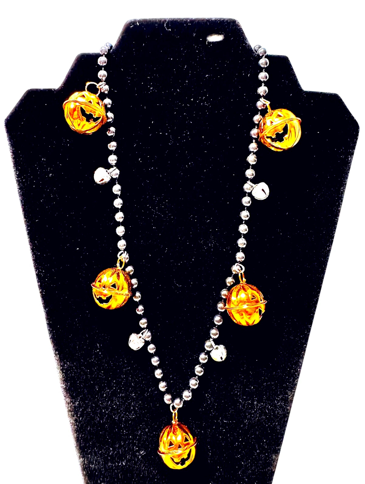 Halloween Vintage Jack O' Lantern Orange Silver Jingle Jangle Dangle Bells Black Beads Fun Whimsical 30" Pull On Necklace. Excellent Condition, no breaks or scratches. Same or next business day USPS Shipping.