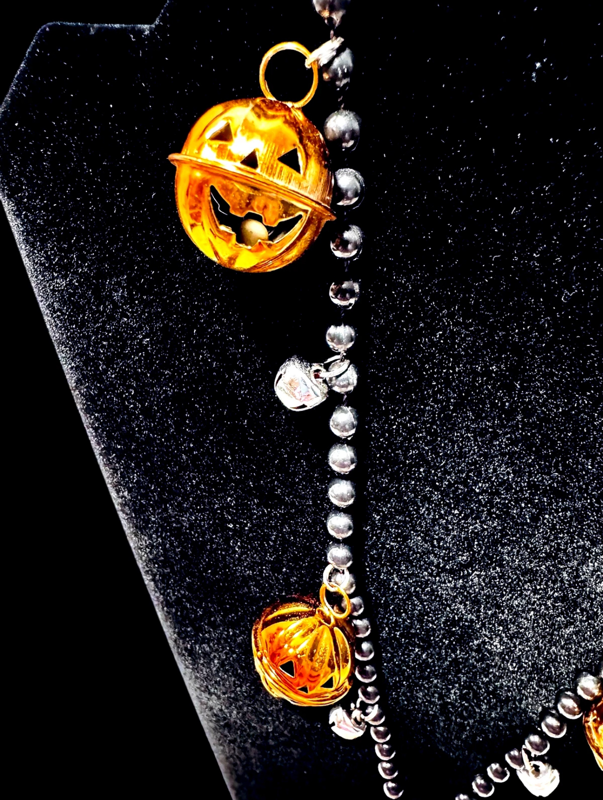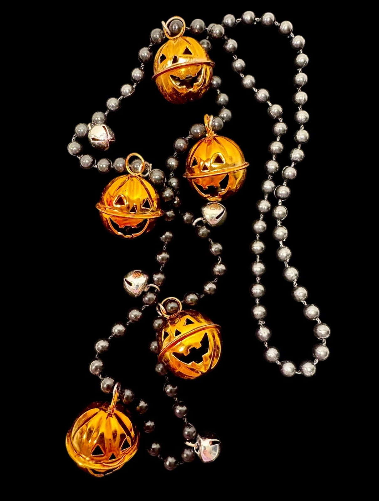 Halloween Vintage Jack O' Lantern & Silver Jingle Bells Black Beads 30" Necklace