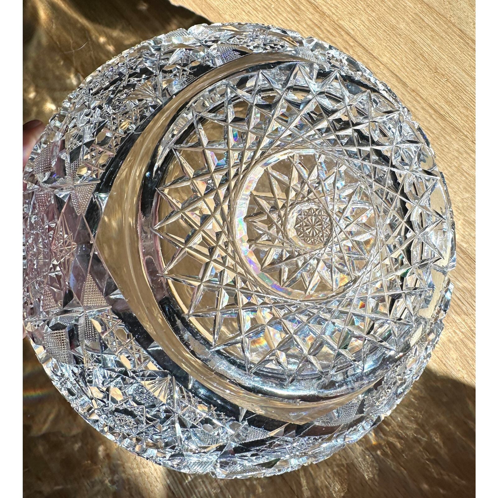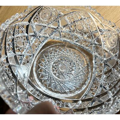Antique American Brilliant Period Cut Glass Large Bowl Diamonds Hobstars Fans-Presented is an exquisite antique American Brilliant Period Cut Glass large bowl.It is a wonderful hand-cut. The lead crystal is beautiful and clear. This bowl is ABP American Brilliant period. It dates circa the 1890s through 1910.Any could have made this bowl of the following exceptional makers:Hawkes, Libbey, Dorflinger , Egginton, Hoare, Jewel, Meriden, Sinclaire, Tuthill, or Fry. This piece is in excellent overall condition. There are a few minor chips to the saw tooth rim but nowhere else. There are no cracks and no repairs. Enjoy this lovely American Brilliant Period bowl for your next celebration! Diameter: 9 inches; Height: 4 inches;3/8" thick. It is HEAVY.
