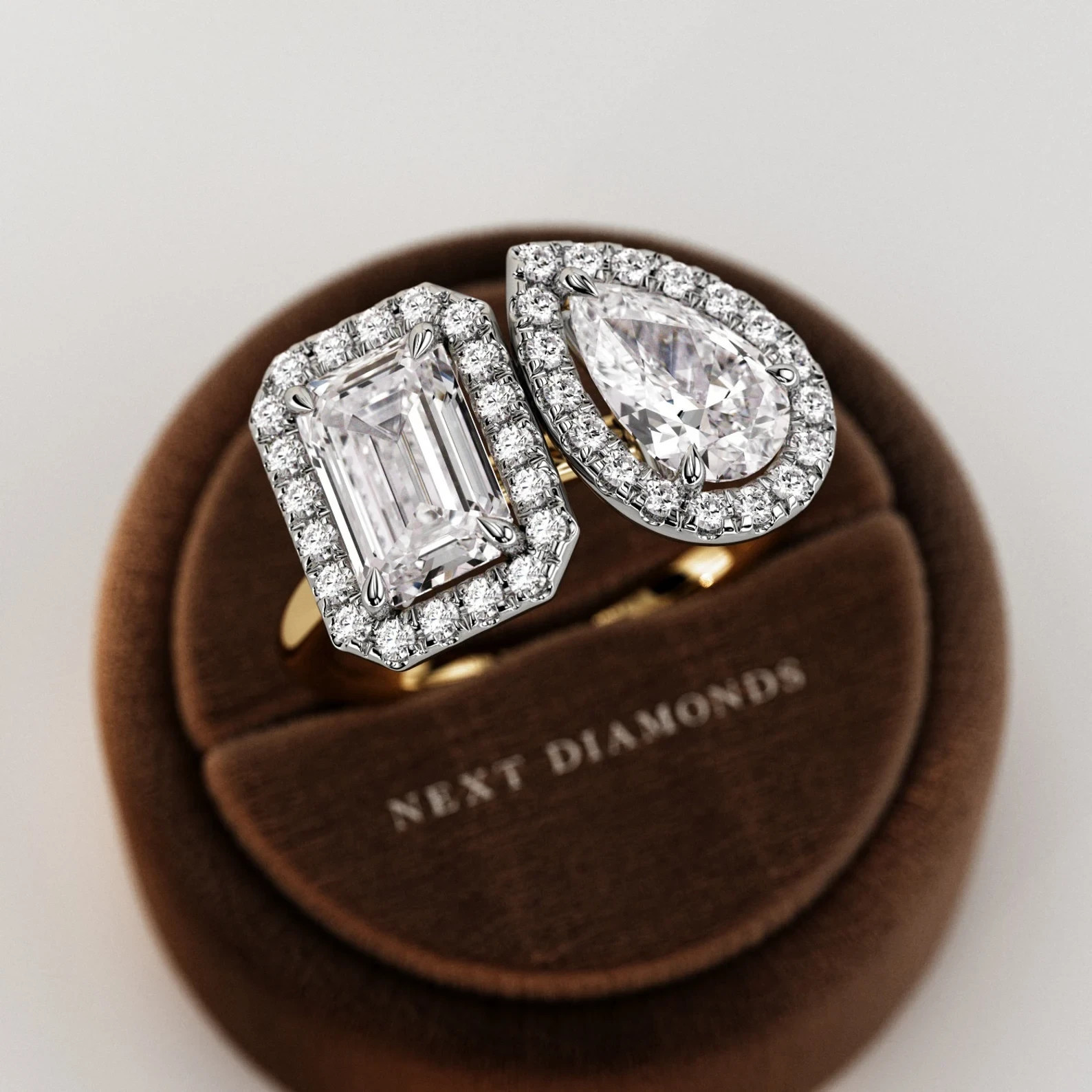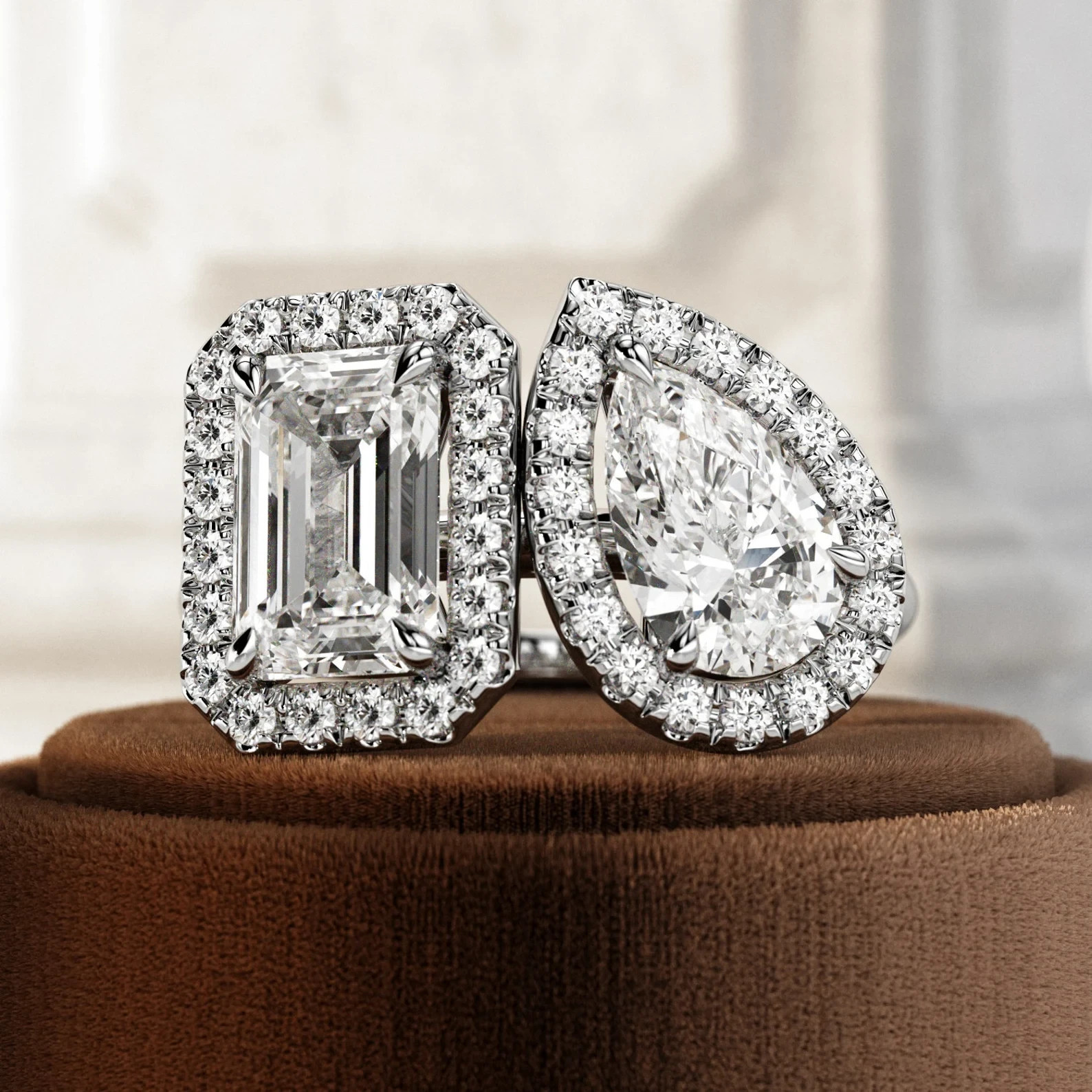 2.50 Ct Toi et Moi Halo Emerald Cut & Pear Cut Lab Grown Two Stone Diamond Ring