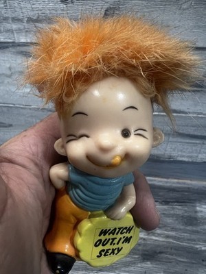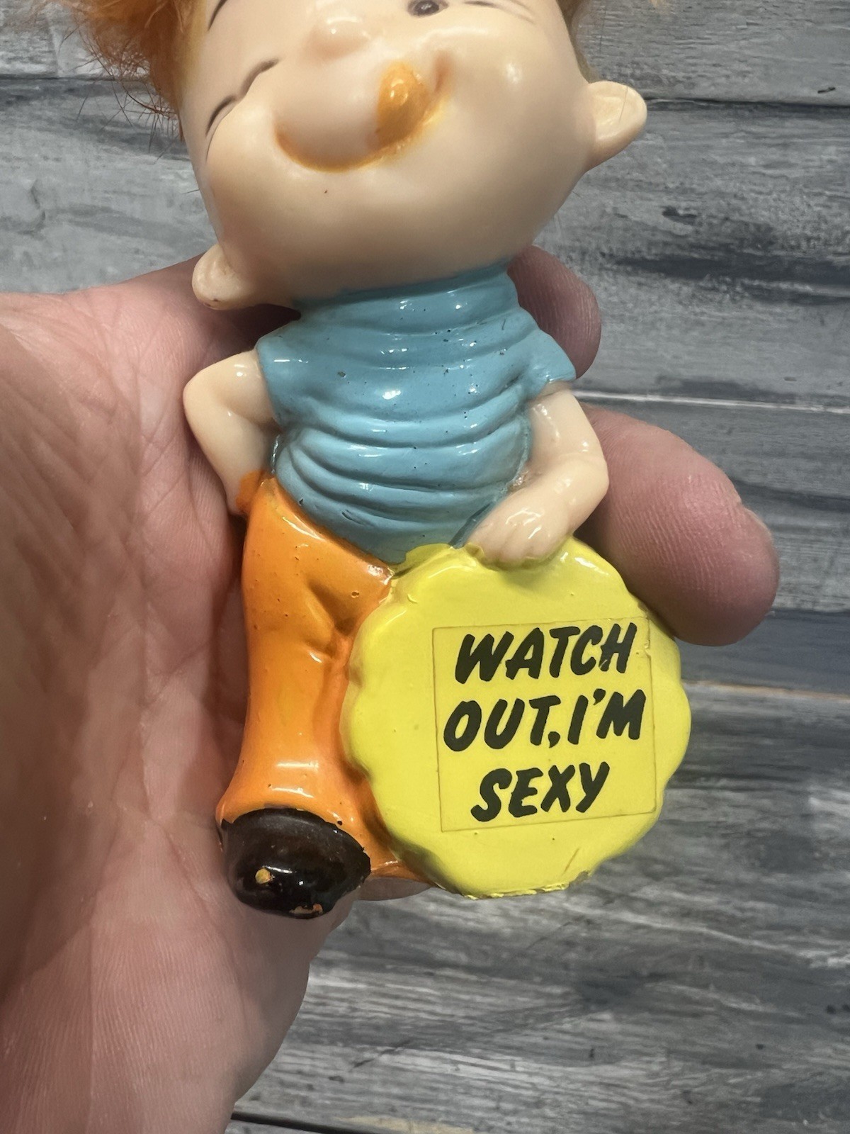 The product is a vintage figurine from 1970 called "Watch Out I'm Sexy" by Its The Berries. It was manufactured in Hong Kong, showcasing a playful and retro design. This collectible sculpture is a charming addition to any decor, offering a touch of nostalgia and humor.