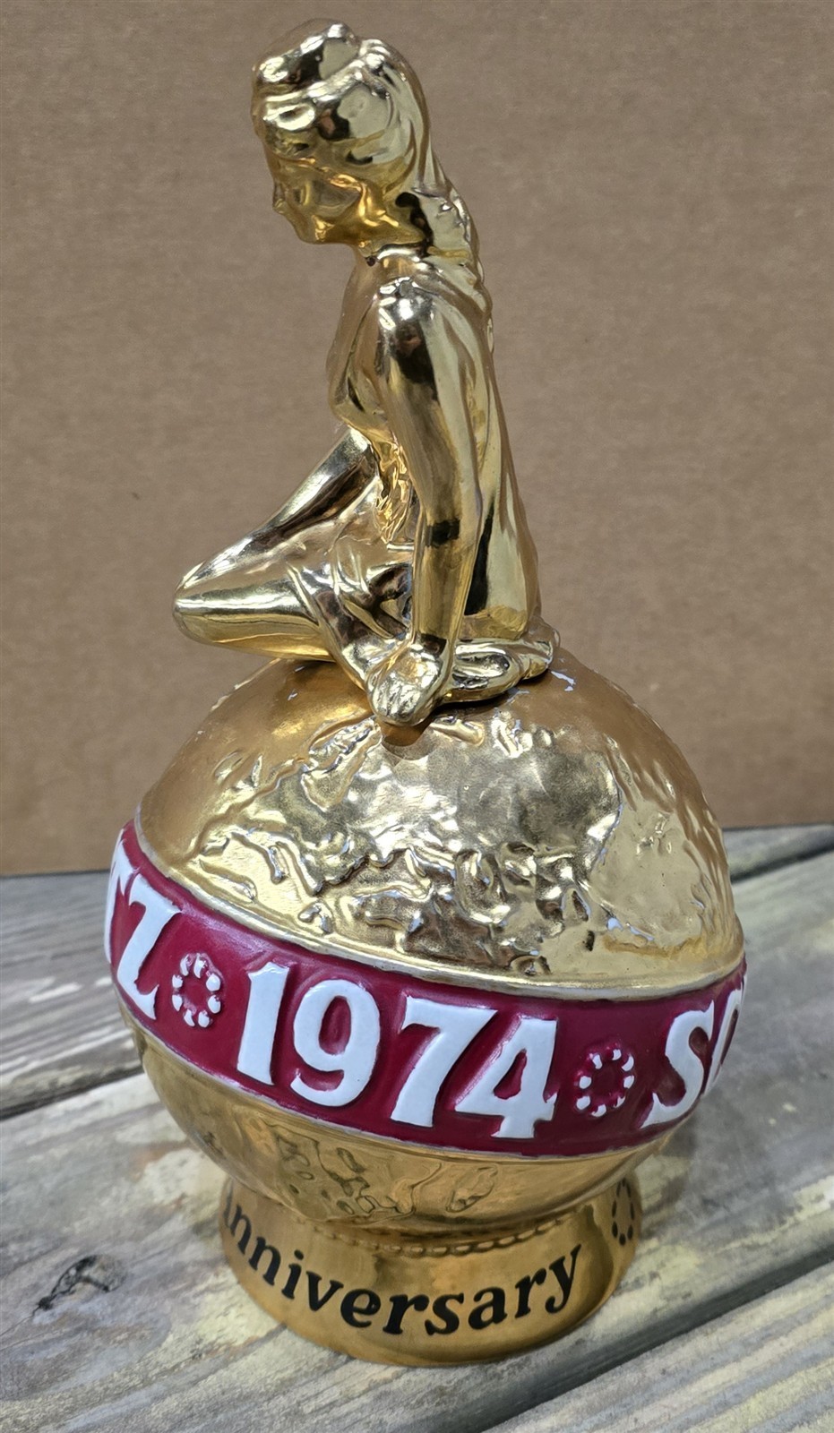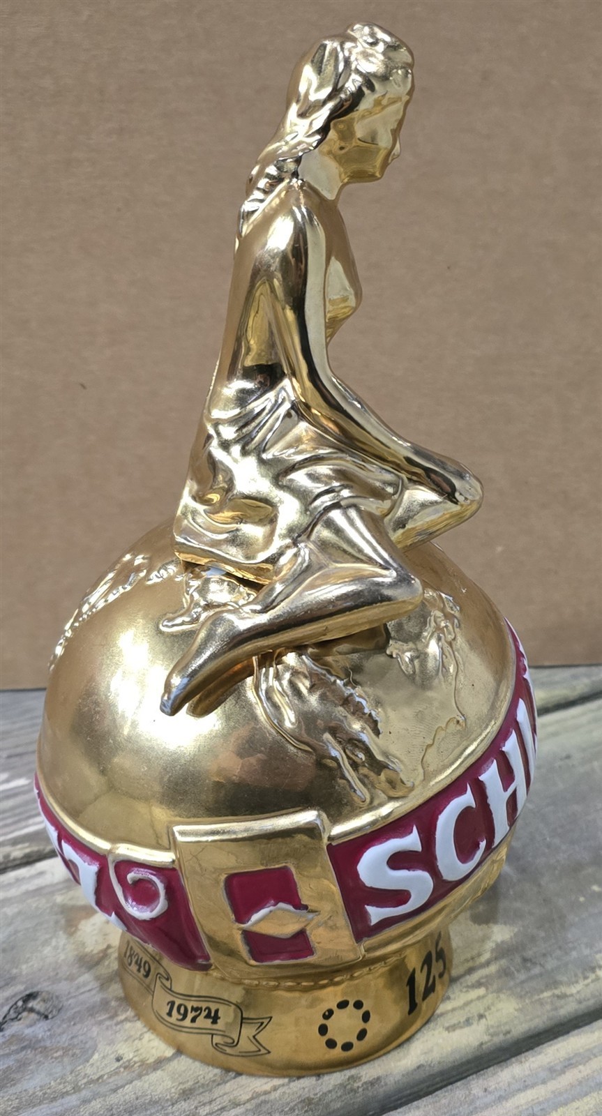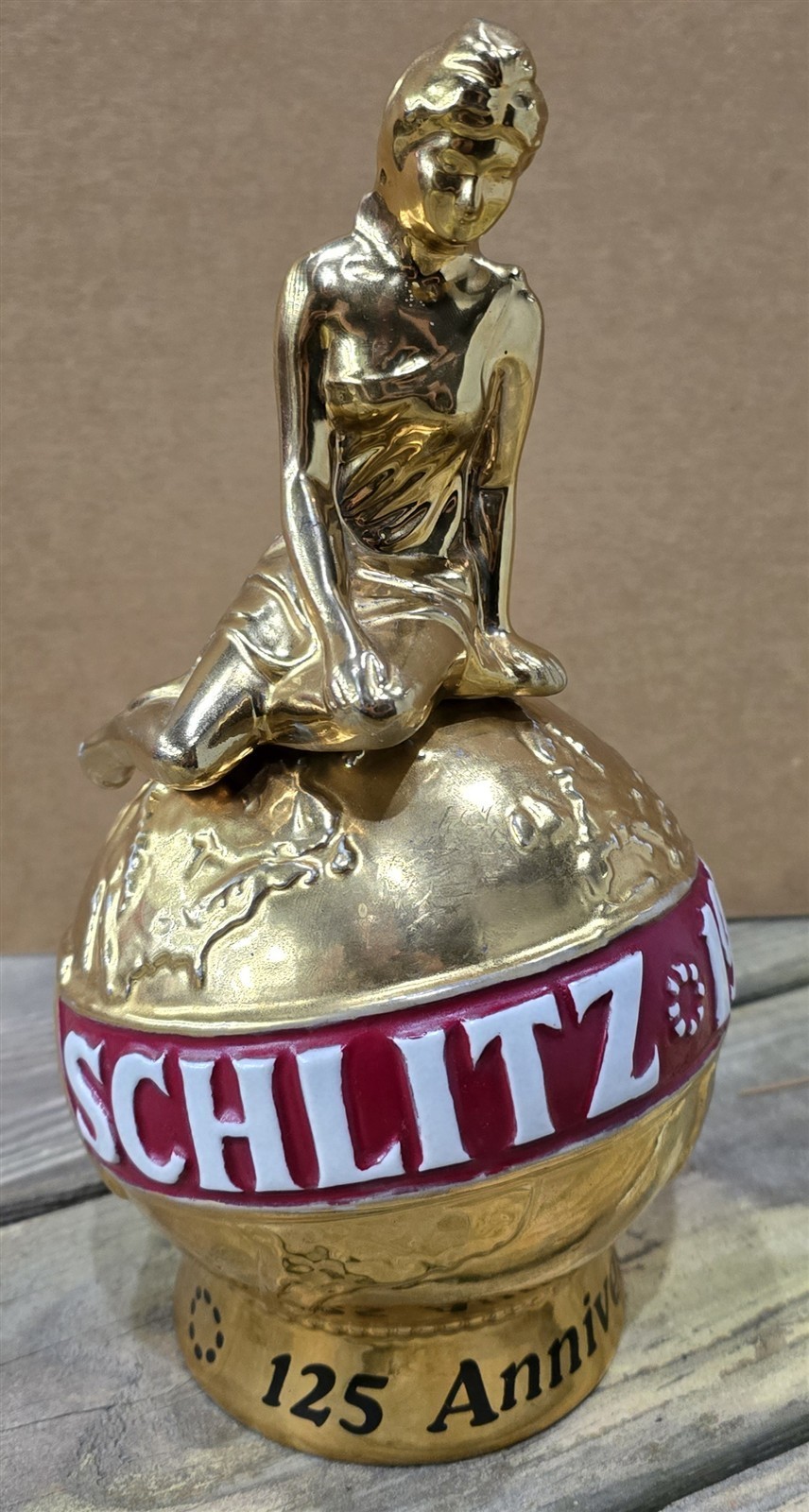 This sale is for a vintage ceramic decanter, made by Ceramarte, 1974 Schlitz 125 Anniversary, good to excellent condition, dusty and needs to be cleaned, came out of a restaurant/bar in Parksville, NY, no cracks, no chips, no crazing, lightest of scratches from use and storage, wear in paint were woman sits on top of the globe, measures approximately 5 3/4" diameter x 10 1/2" high, from a smoke free home.