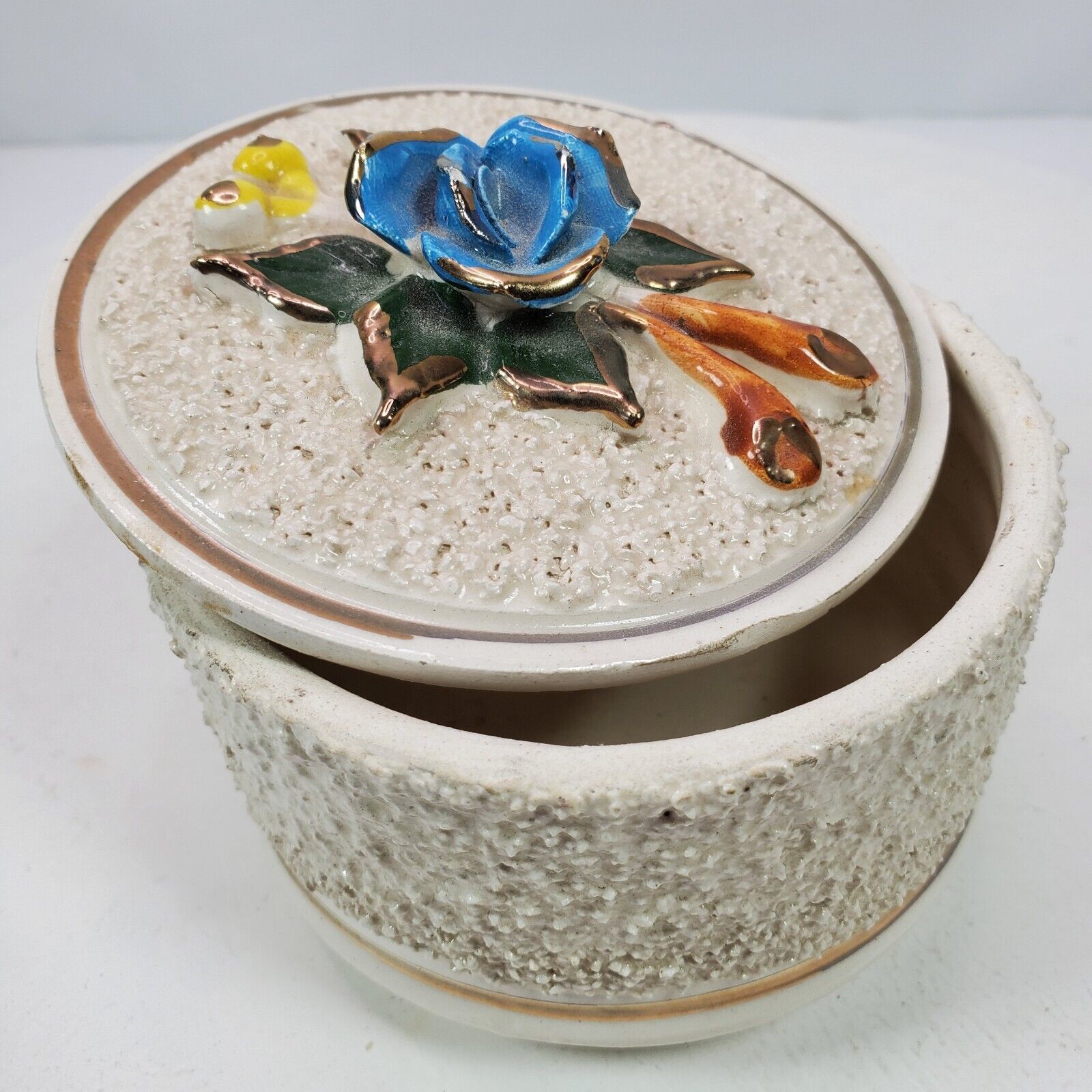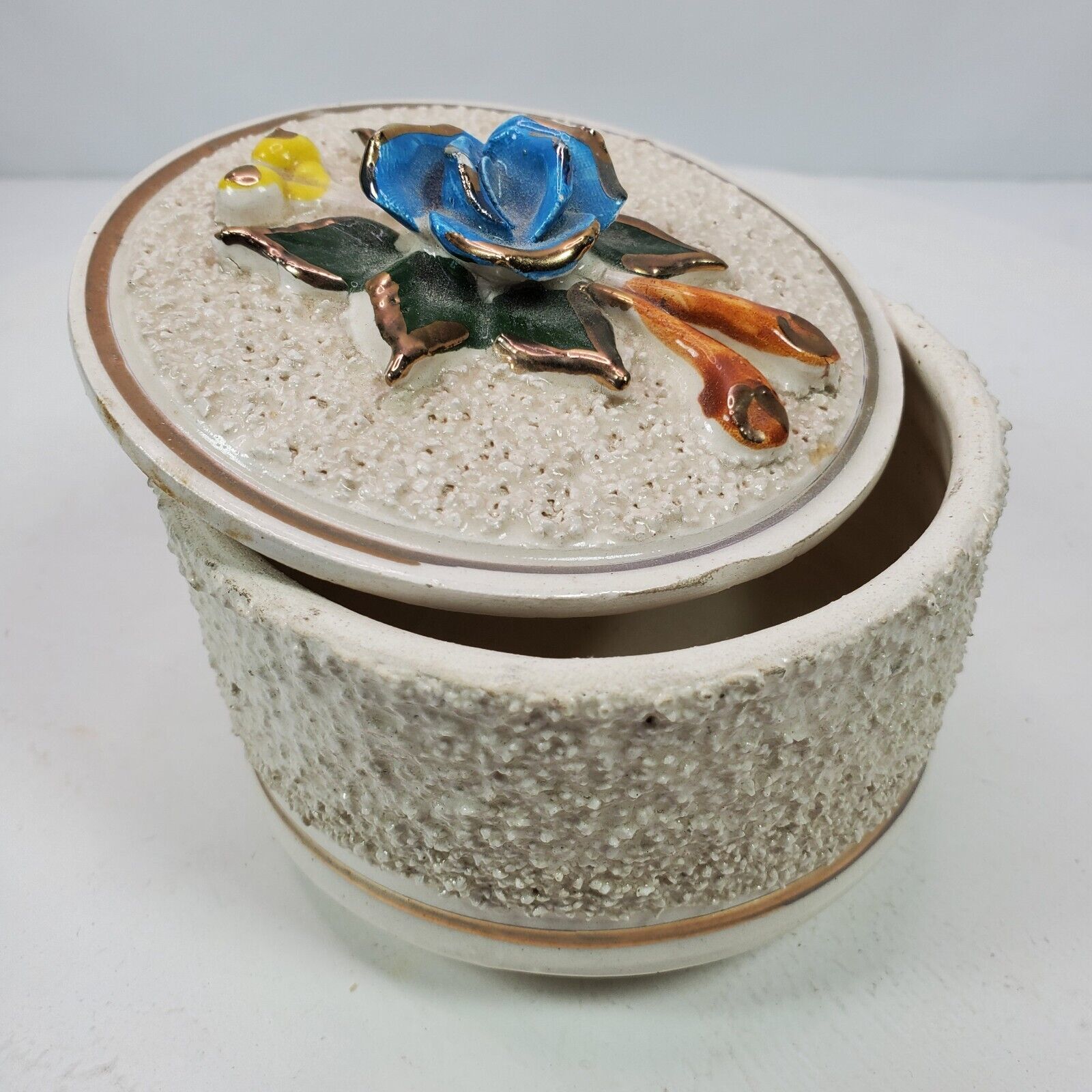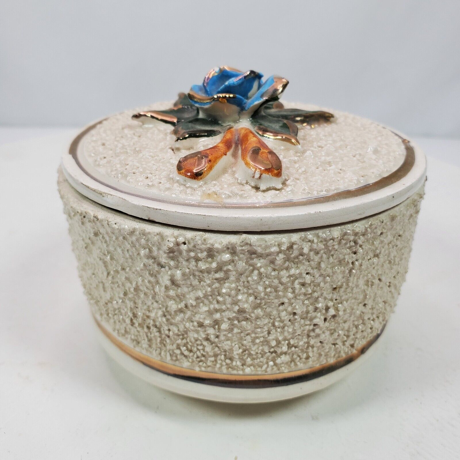 Vintage 1979 Trinket Box w/ Lid 4x3.5Inch Blue Rose Beige Ceramic