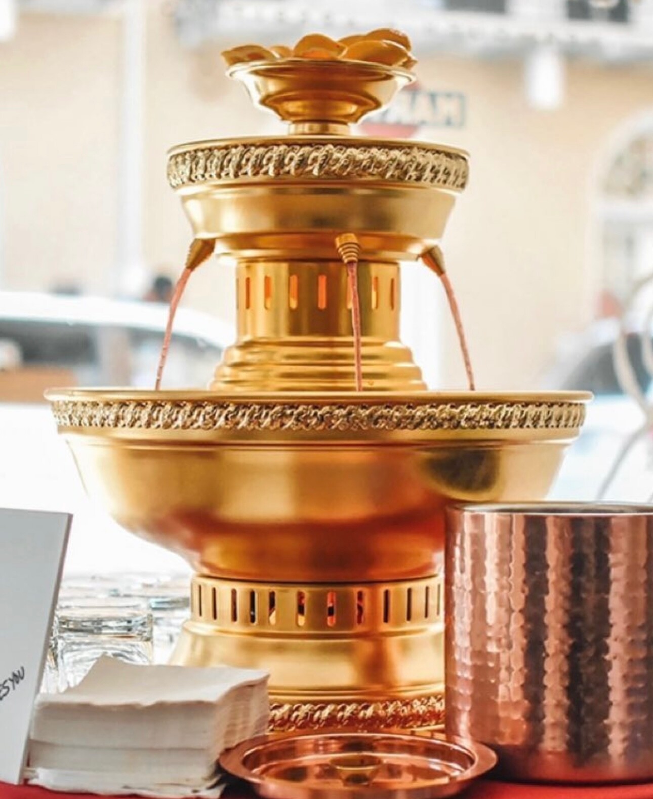 Gold Anodized Aluminum Multi-Beverage Champagne Fountain. This fountain can create a unique self-serving beverage station ? which can alleviate the pressure on bar staff or create a station specifically for a signature drink at cocktail hour, happy hour, location for a transitioning space, or a place created just for the kids. All of our fountains serve alcoholic and non-alcoholic beverages: punch, champagne, sweet tea, lemonade and cocktails. In fact, if you can mix it behind the bar, you can pour it into a fountain!