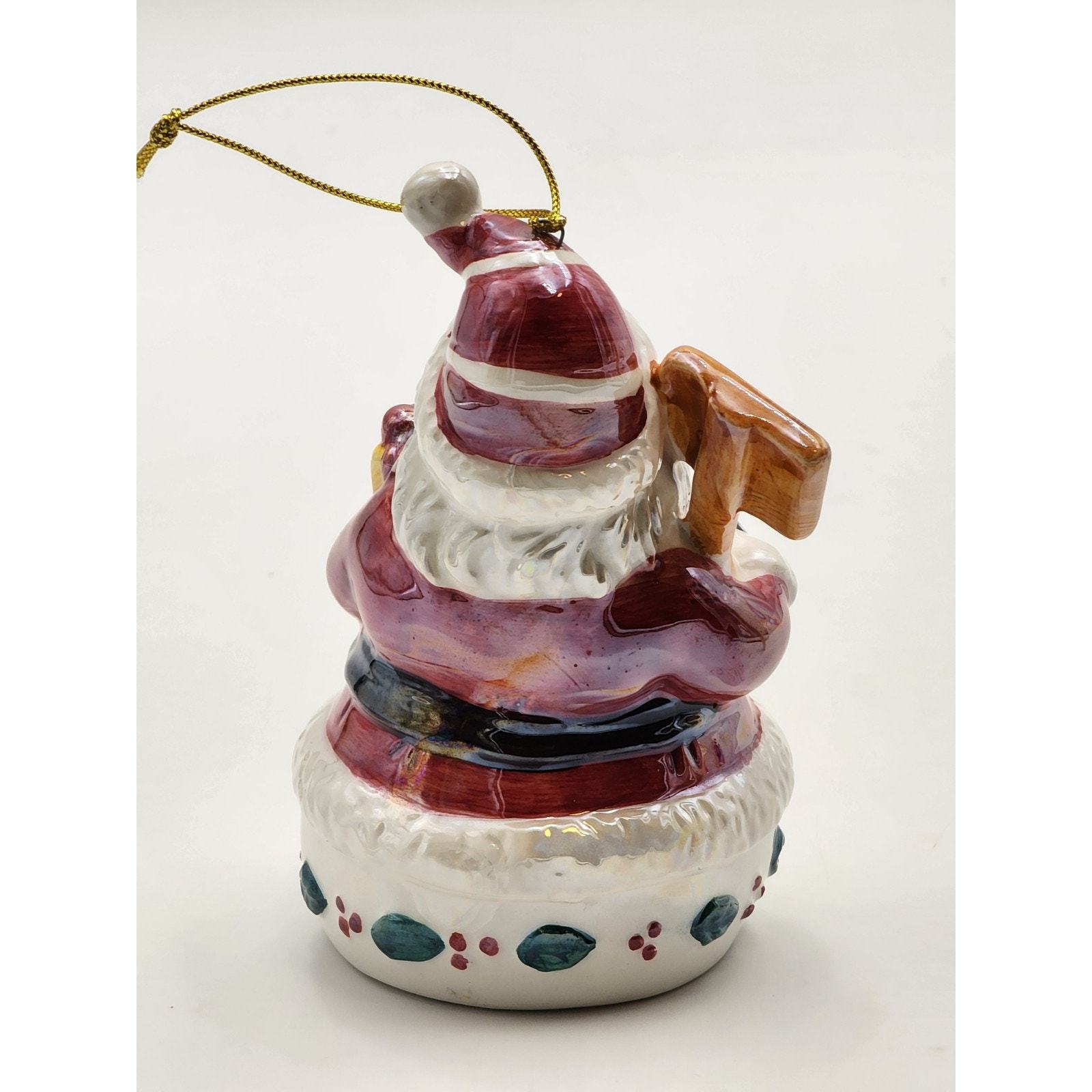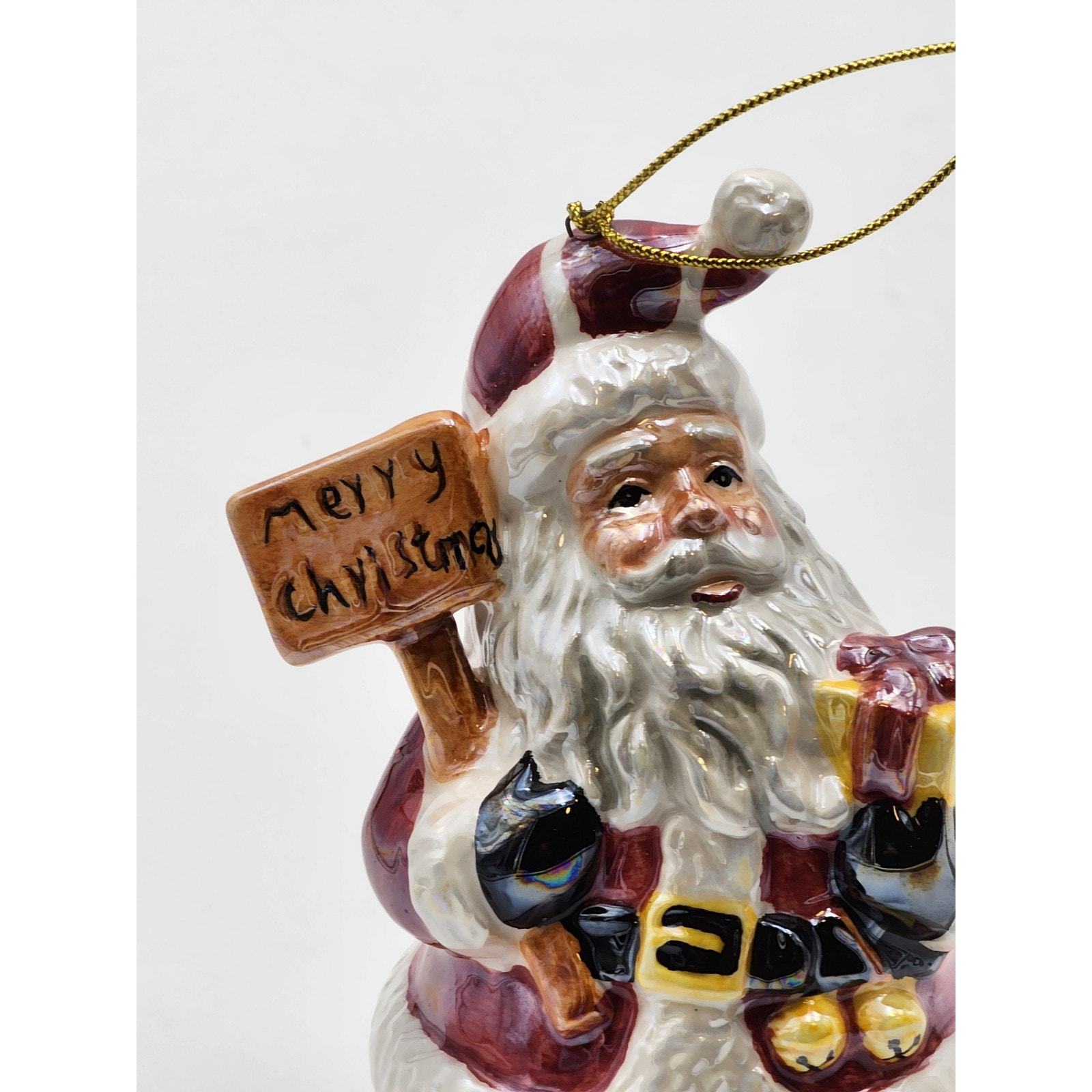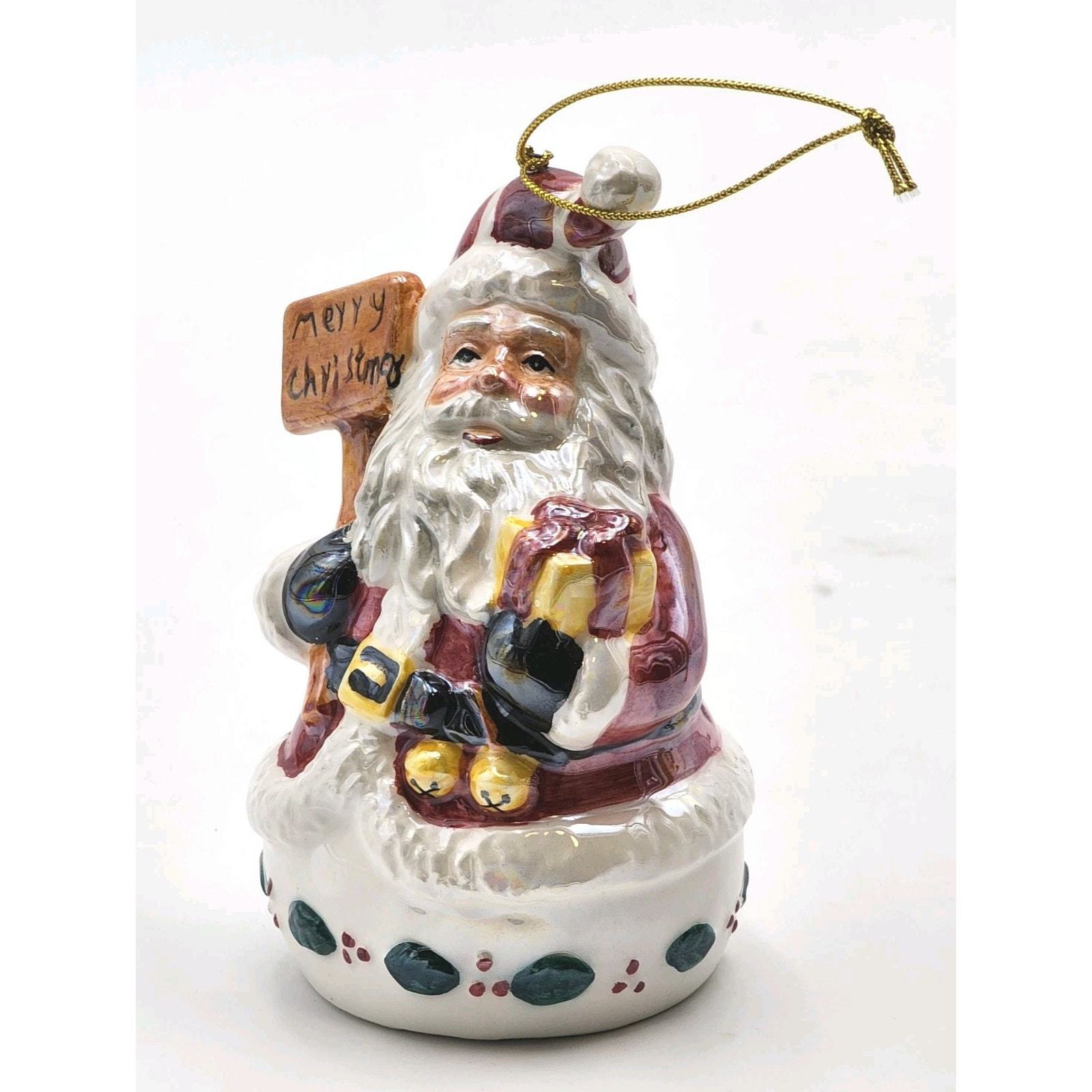 Vtg Iridescent Glazed Ceramic Santa with Merry Christmas Sign and Gift Ornament