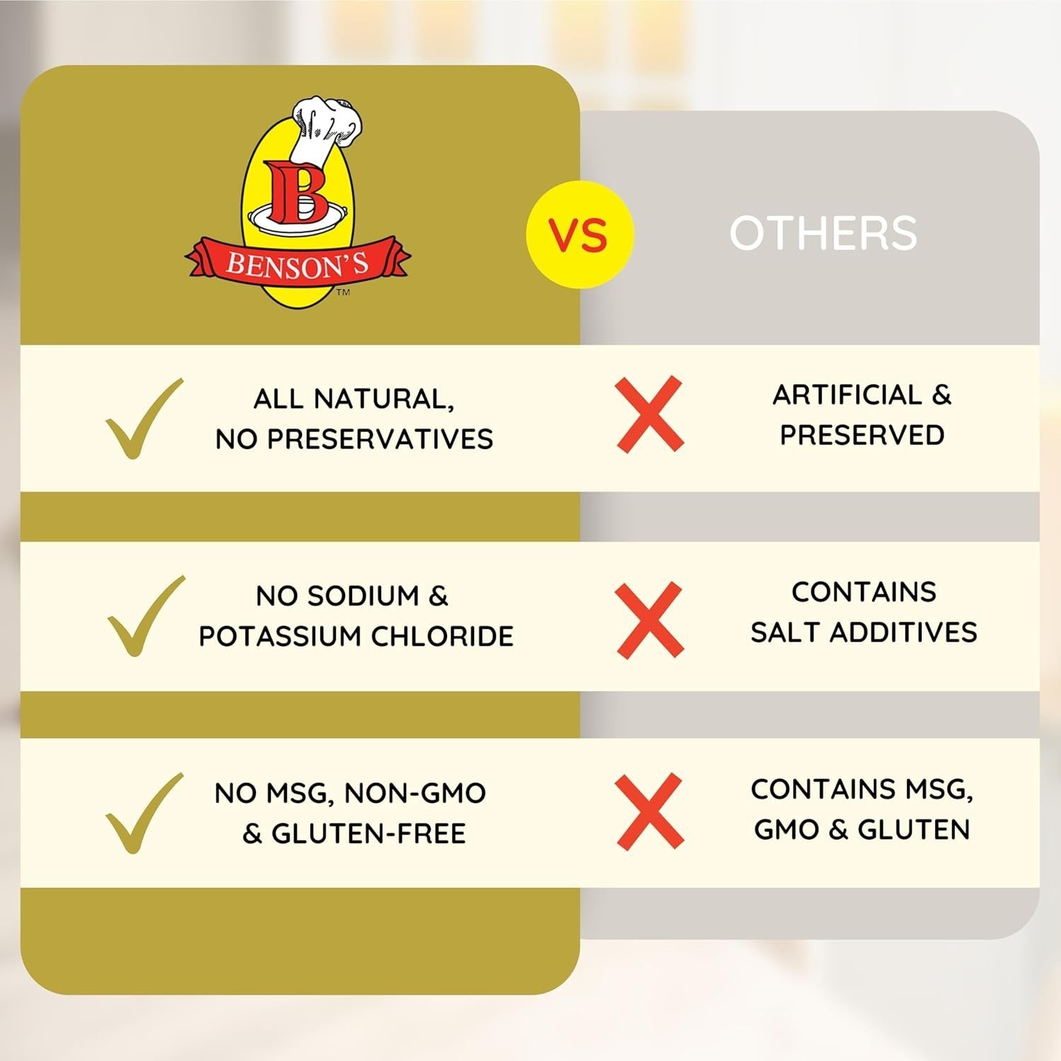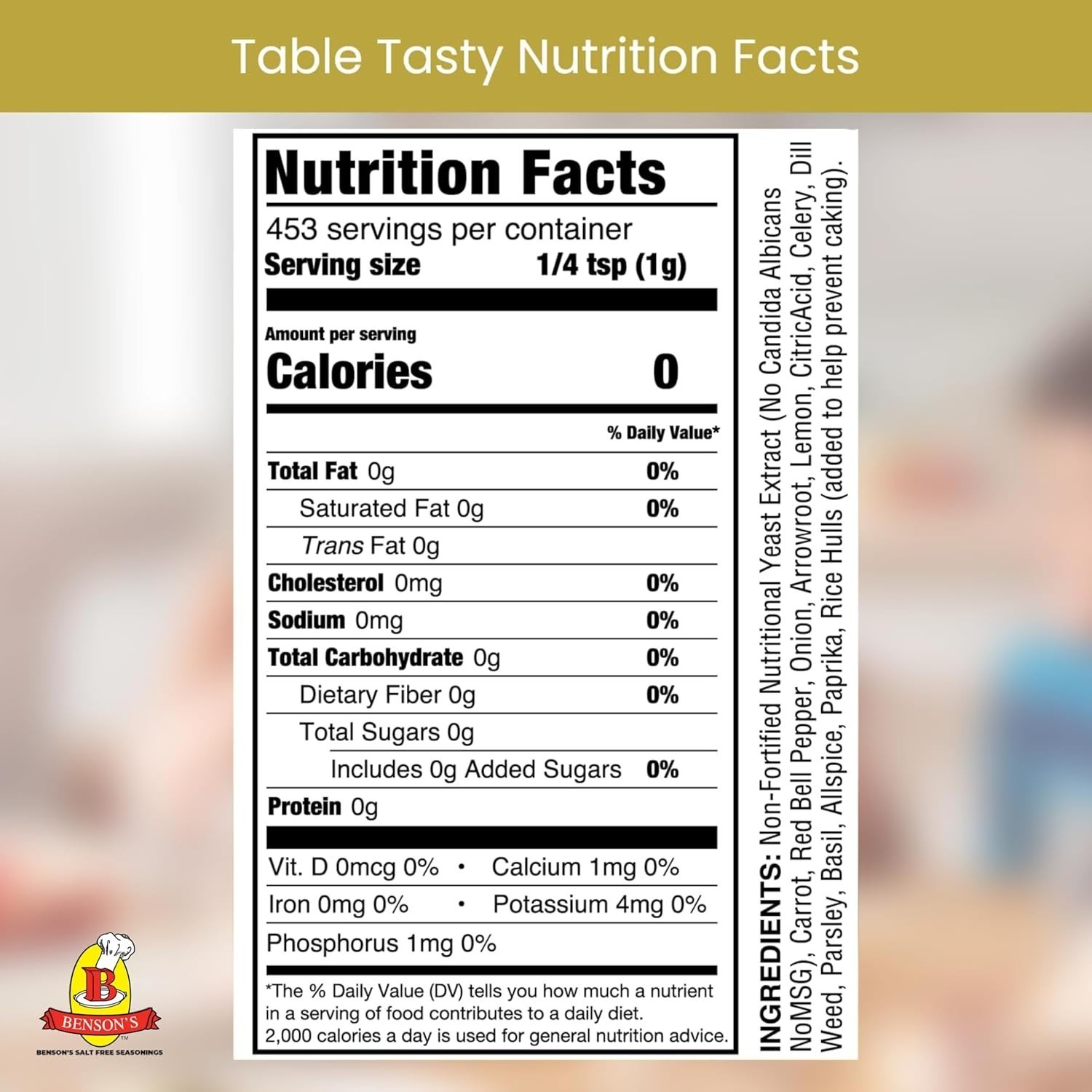 Experience the guilt-free way to add flavor with Benson?s Table Tasty Salt Substitute?your all-around, natural alternative to salt. Made from a blend of vegetables, herbs, and spices, it offers savory, salty taste without potassium chloride, making it ideal for low-sodium lifestyles. Free from salt, sugar, gluten, soy, dairy, preservatives, and MSG, this clean, crave-worthy flavor enhancer supports your healthy eating goals. Sealed for freshness and trusted since 1989, each bottle features a convenient shaker top, ensuring easy use in your health-conscious kitchen.