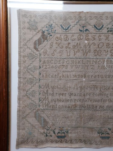 Rebecca Jackson was born in 1799 and made this sampler at 13 years of age in 1812. She married into the Williams family of the historic village of Deerfield, Massachusetts, and is buried in the Deerfield cemetery. Deerfield is a significant historical village in American colonial times as well as the Williams family. Today, the village is like walking back into the 1700s. Please Google the information if you are unaware.