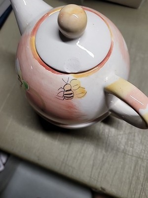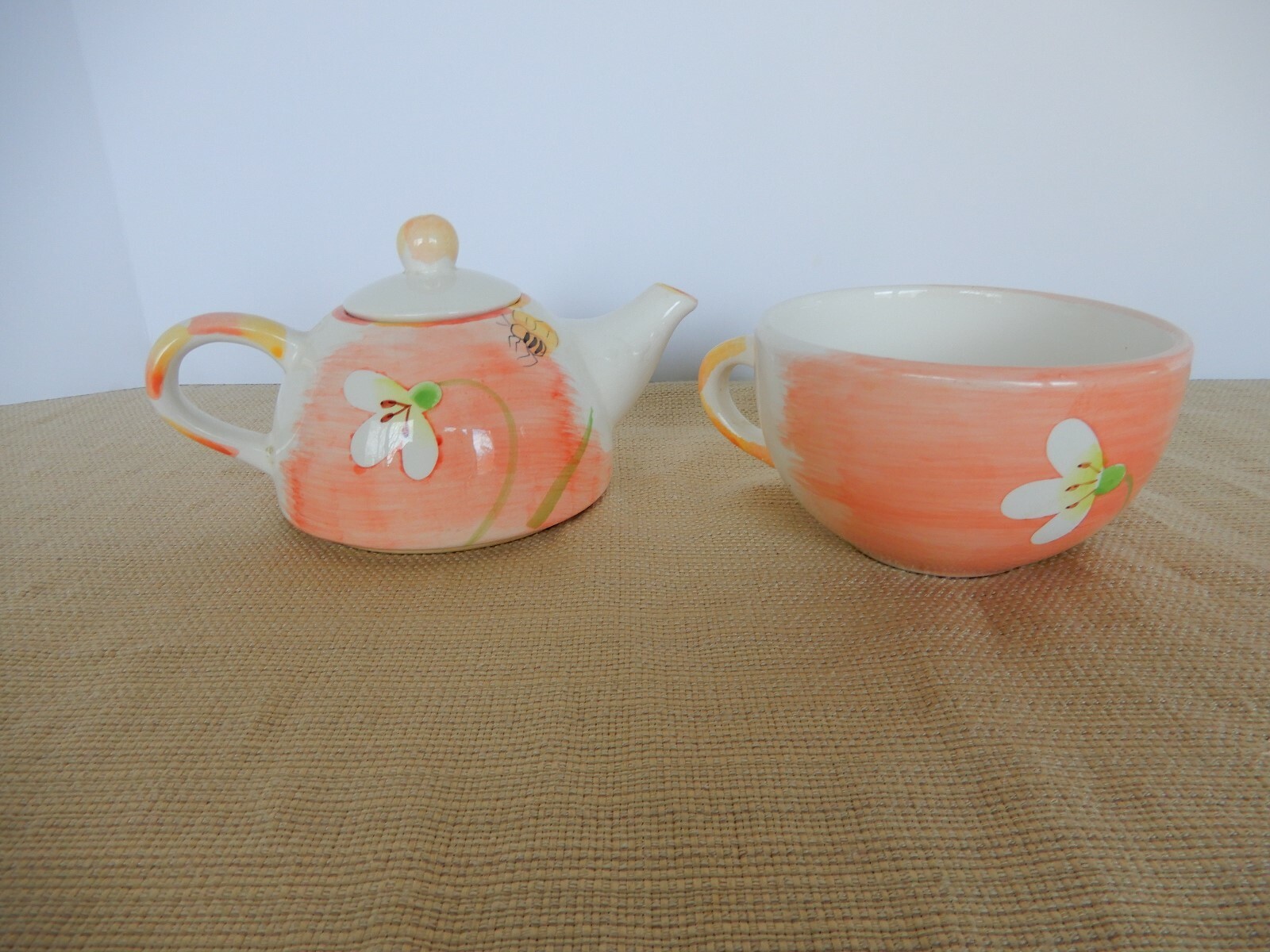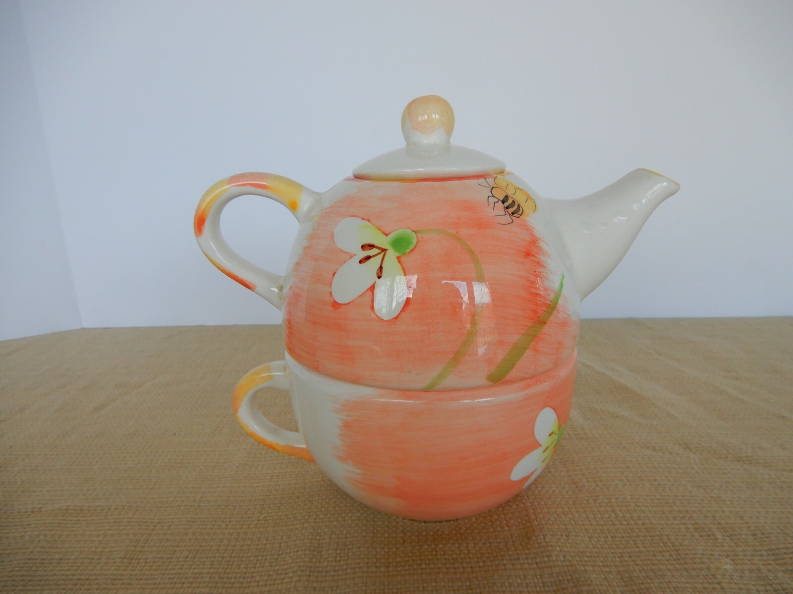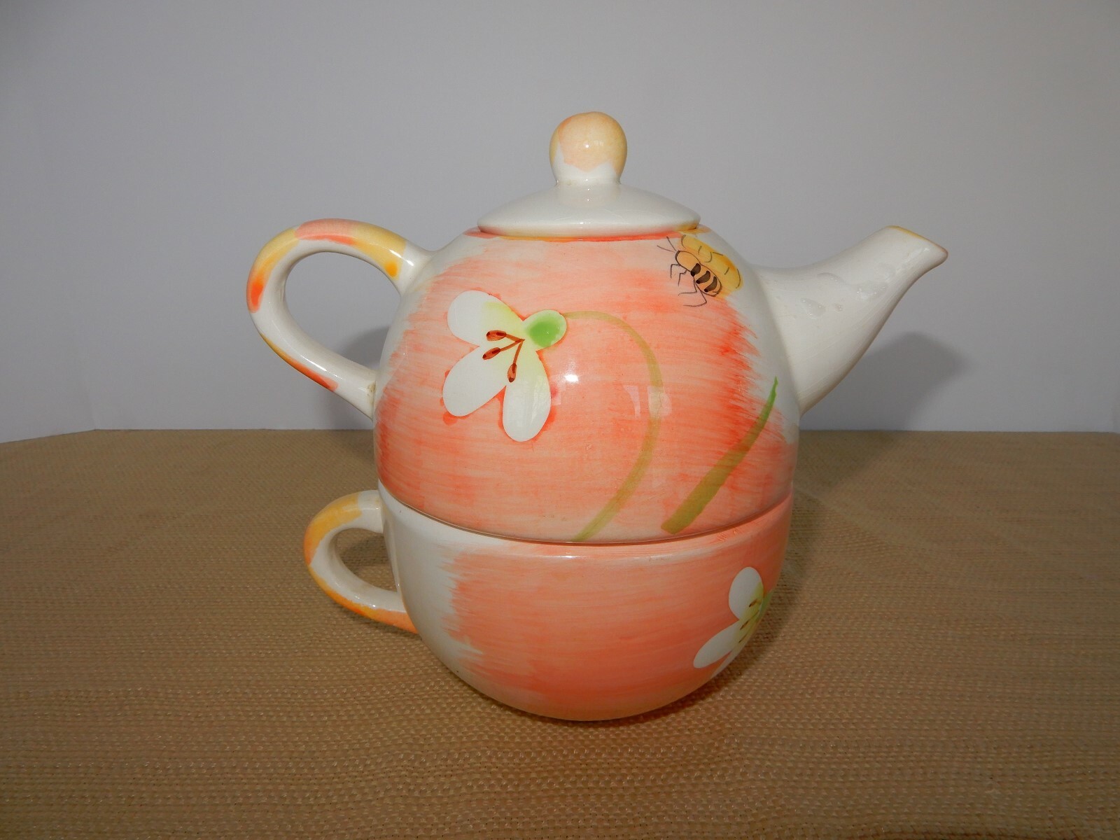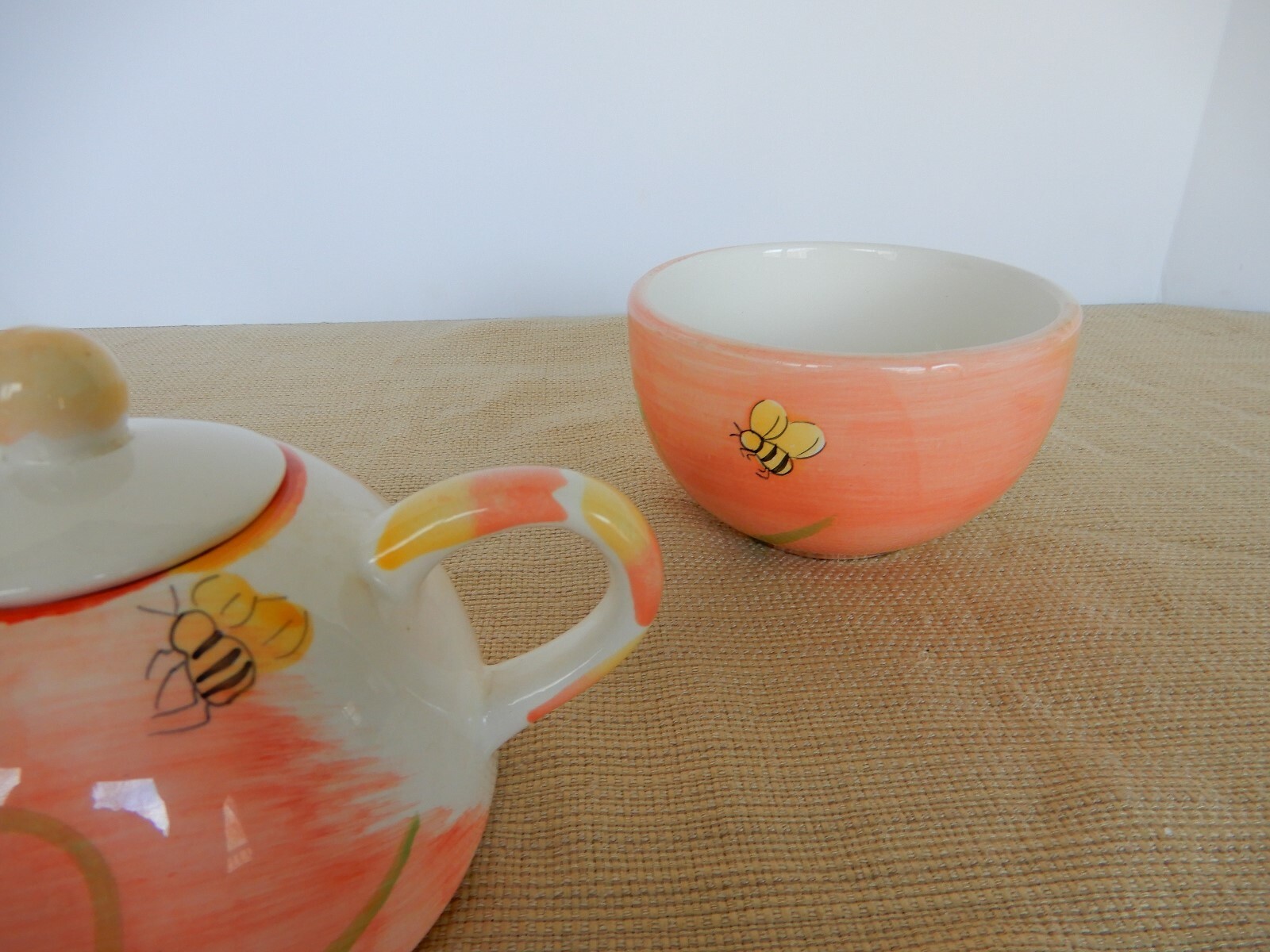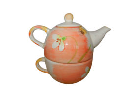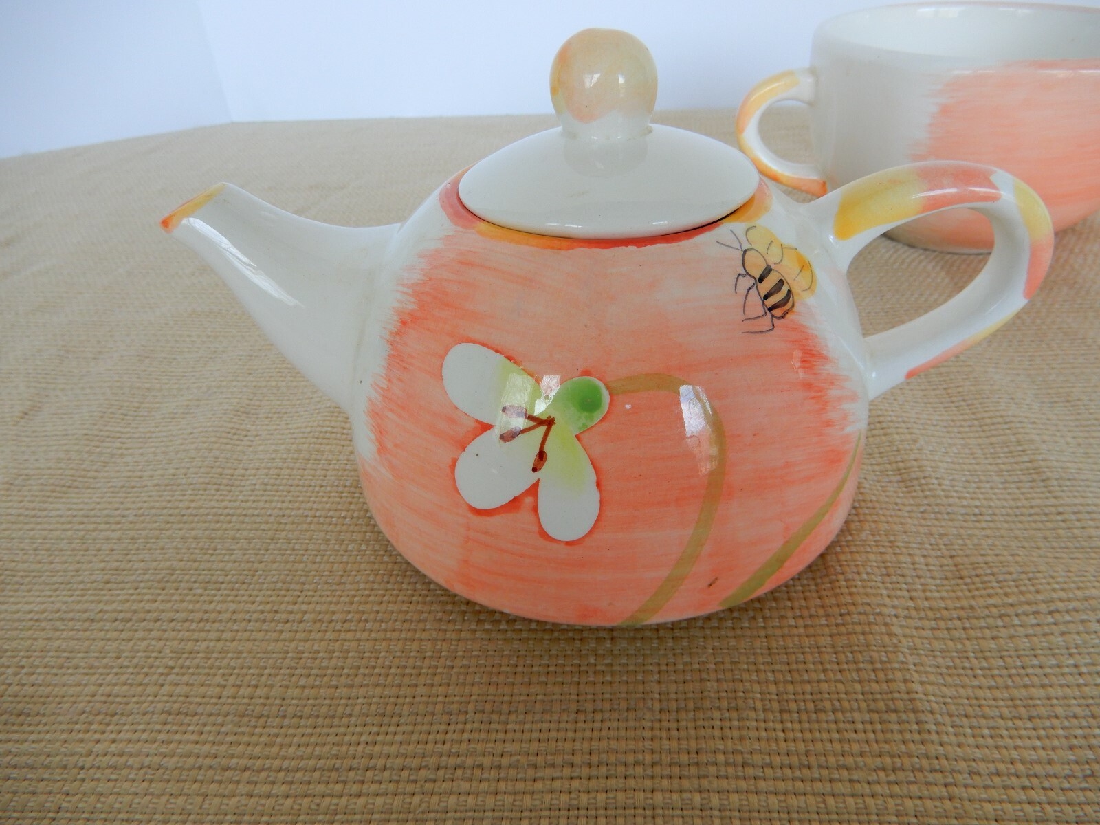 Vtg Single Serve Stacking Teapot & Teacup w/ Honeybee Flower Design Lid Chipped