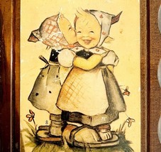 This vintage Hummel wood matte print art depicts a heartwarming scene of 2 young farm girls smiling, making it a perfect addition to your farmhouse-style wall decor. The rectangular plaque features a multicolor design on wood, with a matte finish and scalloped edges that adds to its rustic charm.